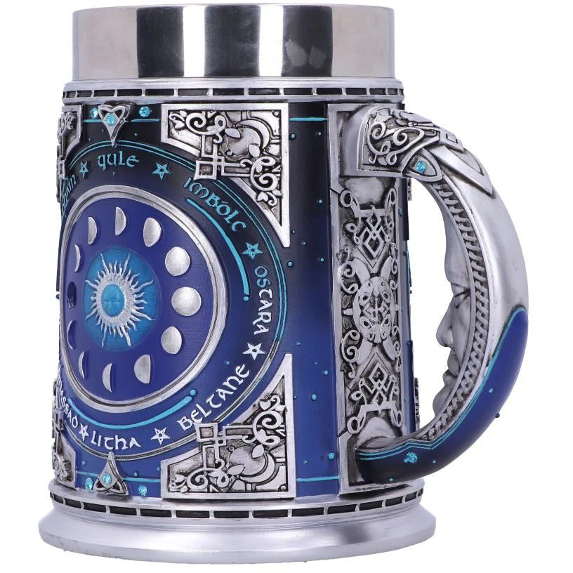 Featuring all the different phases of the moon, in accordance with the different pagan holidays. This piece is perfect for any alternative store or Wiccan collection. On the handle of the tankard, a beautiful silver moon face can be seen facing towards the cup, resting its eyes. Cast in the finest resin before being expertly hand-painted, this tankard has a stainless steel insert for ease of cleaning.