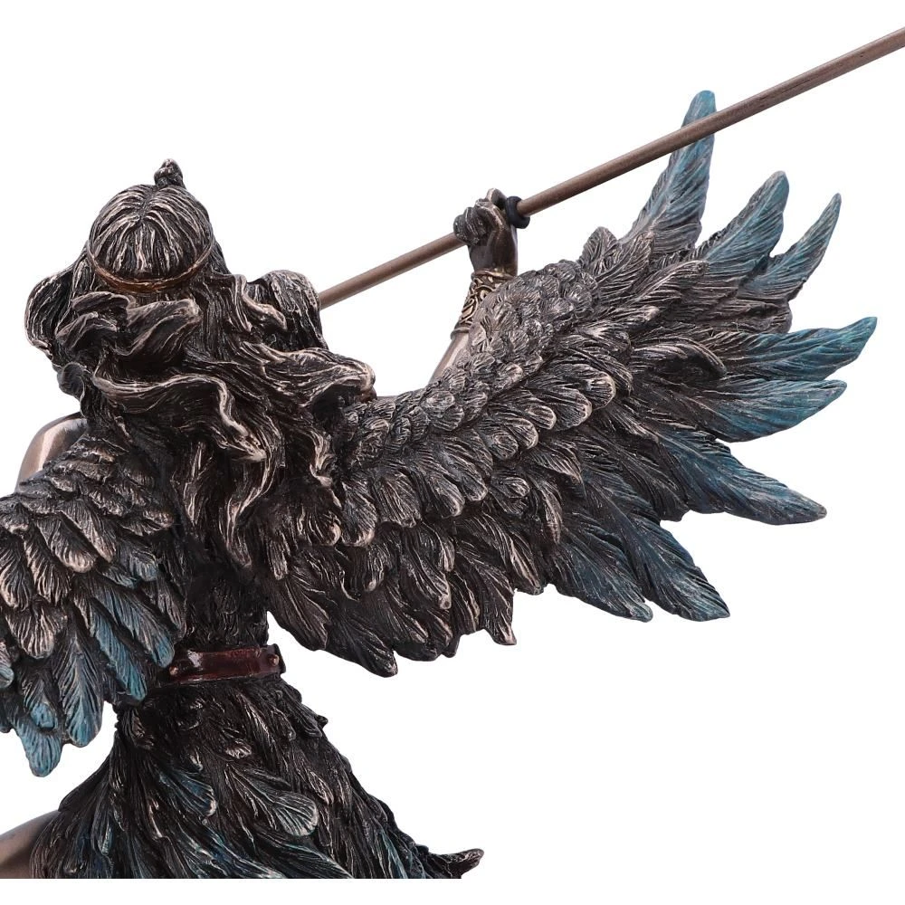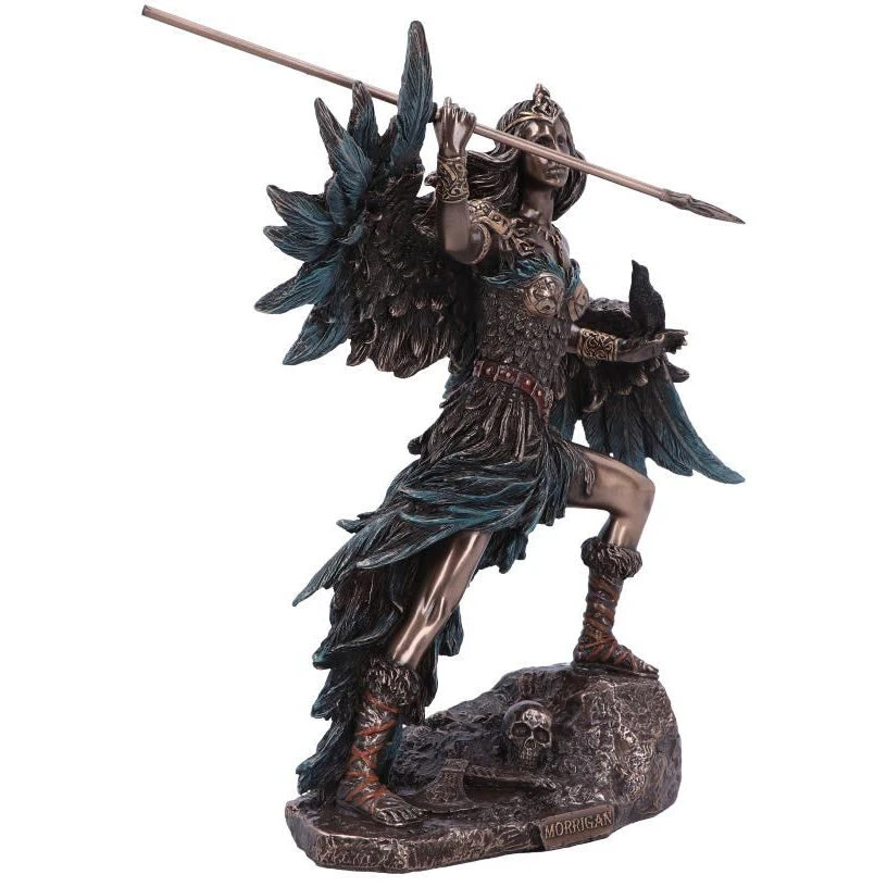 Morrigan is a Celtic goddess of war and death, who can be seen with a leg raised upon a rock as she draws back a spear. Her armor and wings include beautiful blue detailing, symbolising the myth that she took the form of birds on the battlefield and feasted on warriors’ flesh. On her hand sits her trustee crow, accompanying her during battle. Making this figurine the perfect addition to any mythical collection or alternative gift store. Cast in the finest resin before being given a bronzed finish.