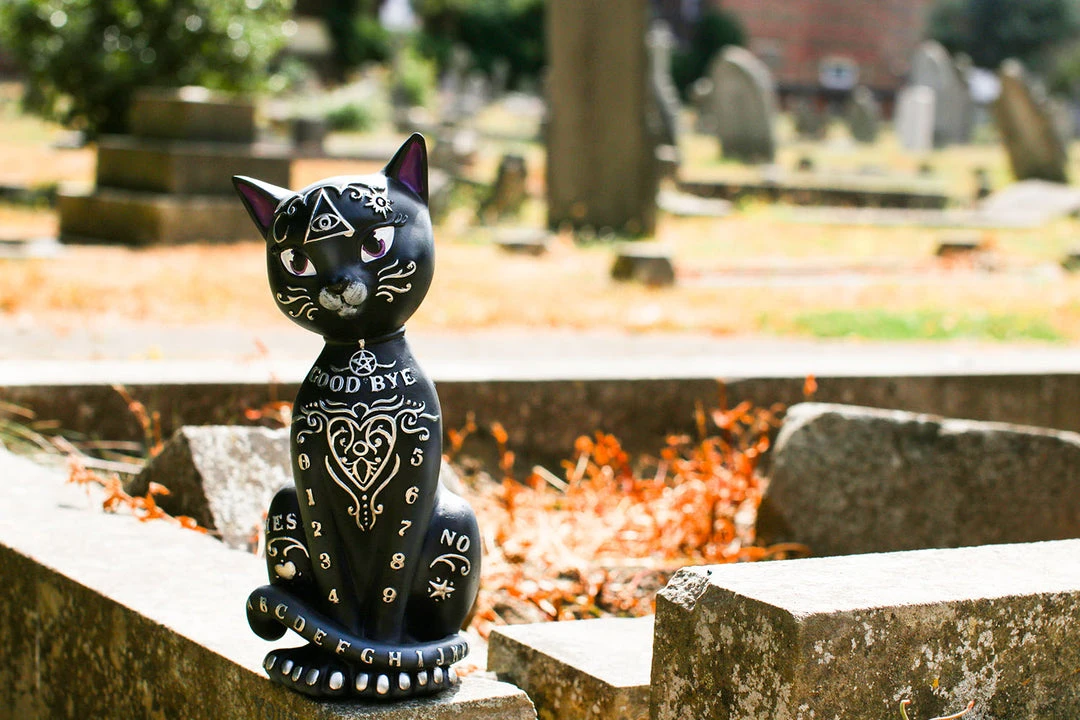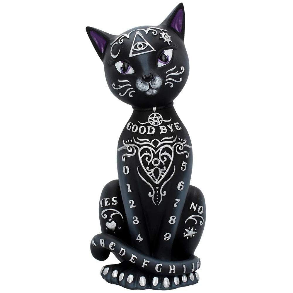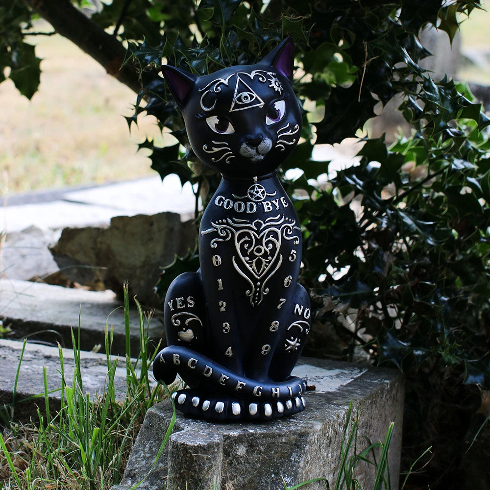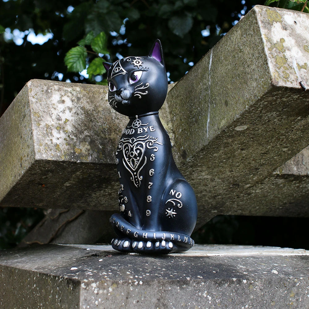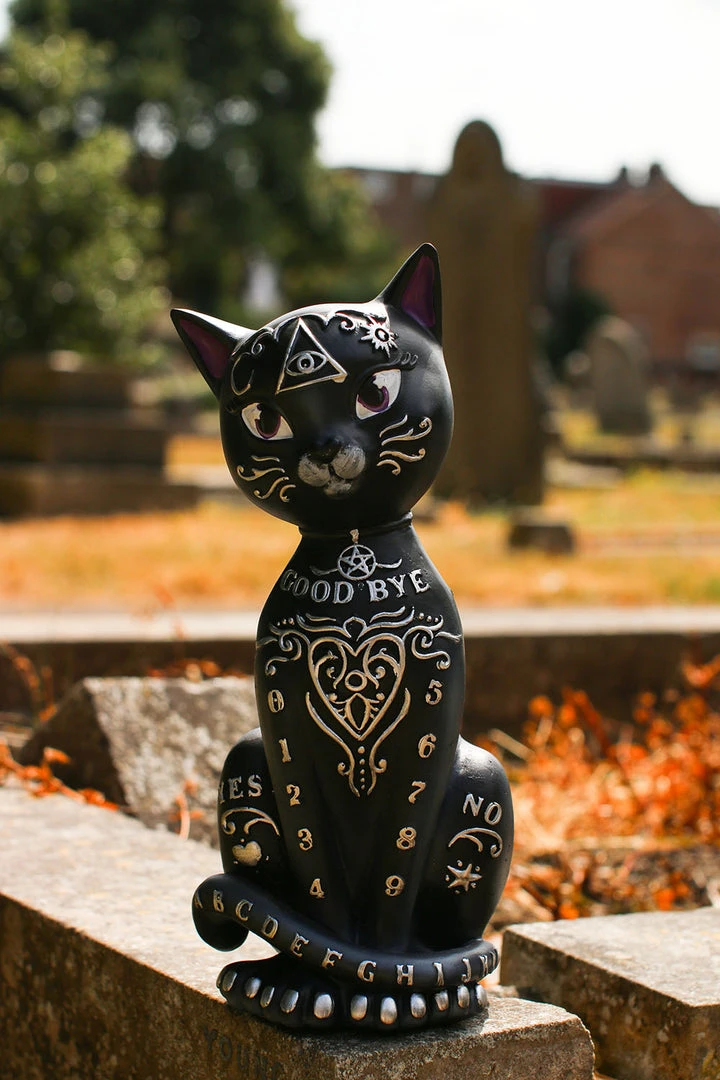 Walk and talk between worlds with the Mystic Kitty. Sitting up, this black cat looks at you inquisitively, large purple eyes betraying a preternatural intelligence. Silver letters and numbers cover their fur, mimicking a spirit board – the numbers 0 to 9 are down their front legs, “Yes” and “No” are written on their knees, and the letters of the alphabet start at the tip of their tail and continue up their back. A baroque heart-shaped planchette design is repeated on their front and their back, and the word “Goodbye” appears below the silver pentacle hanging from their collar. A pyramid with an eye in it is picked out on their forehead. Cast in the highest quality resin before being carefully hand-painted, this mysterious feline can add an air of magic to any shop.
