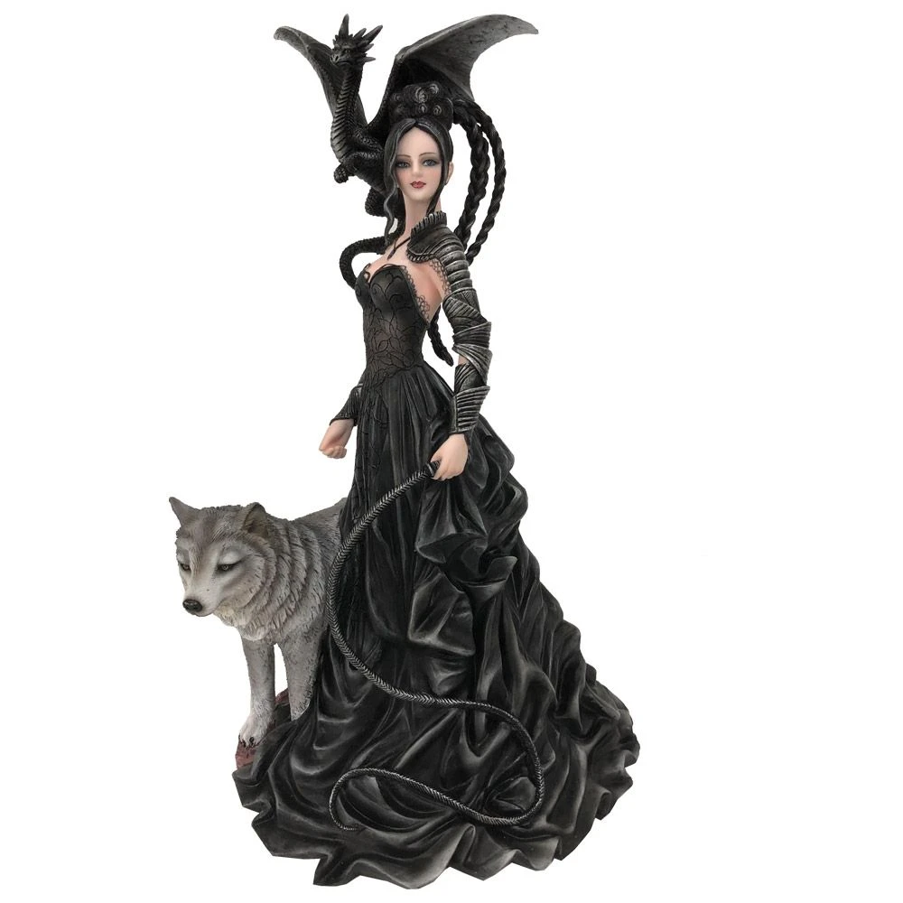 Bellamaestra, The Lady of Pain: From the dark imagination of internationally renowned Fantasy artist Nene Thomas. Bellamaestra, otherwise known as the Lady of Pain wears a black ballgown with a revealing draped sweetheart neckline. In her left hand she holds an even longer whip to vex the unjust. She is accompanied by a gray wolf that stands by her side and perched on her shoulder is miniature black dragon, both poised ready to inflict harm to whomever Bella decides. Cast in top-quality resin before being painstakingly hand-painted, this fantastic figurine adds an air of alternative enchantment to any home.