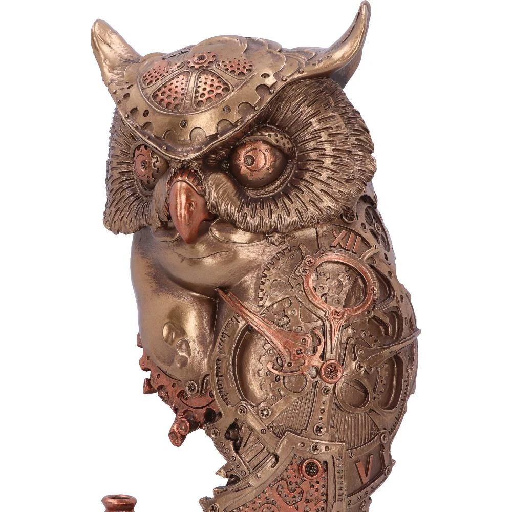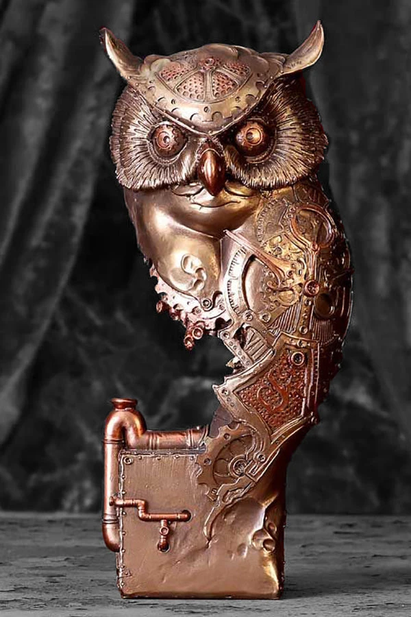 This wise, old, mechanical owl, sits perched on top of a cube, wings covered in cogs and ticking hands of a clock in the centre. Sitting peacefully and wide eyed ready to take flight, this owl is cast in the finest resin before being expertly hand-painted and finished in bronze. This Owl will make the perfect addition to any Steampunk collection.
