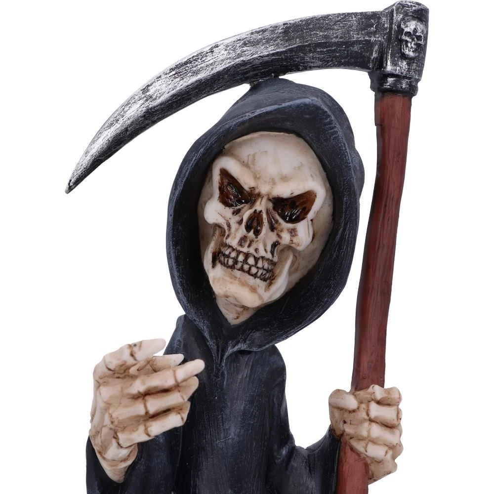 The physical personification of death, the reaper of souls the Grim Reaper guides souls into the afterlife. Meeting the formidable being is a frightening prospect for most humans! This figurine shows the Reaper holding a sand timer his right hand. In his left hand is a scythe, its preferred instrument of death, symbolising removal. With an oversized natural-looking skull, long flowing black hooded-cloak and steel scythe with wooden handle this comedic figurine would make a perfect addition to any Gothic themed home. This figure is cast in the finest resin and hand-painted for a high-quality finish.