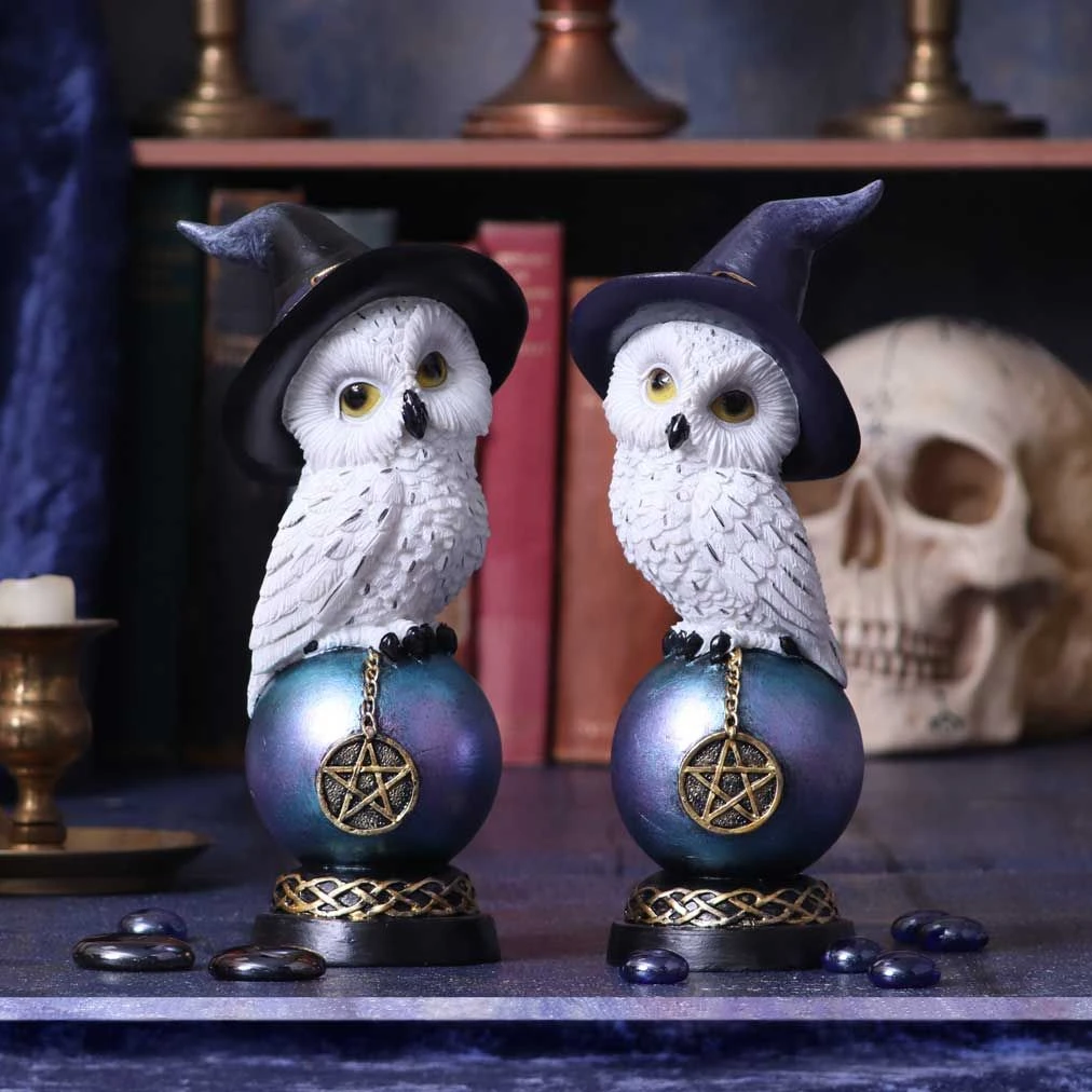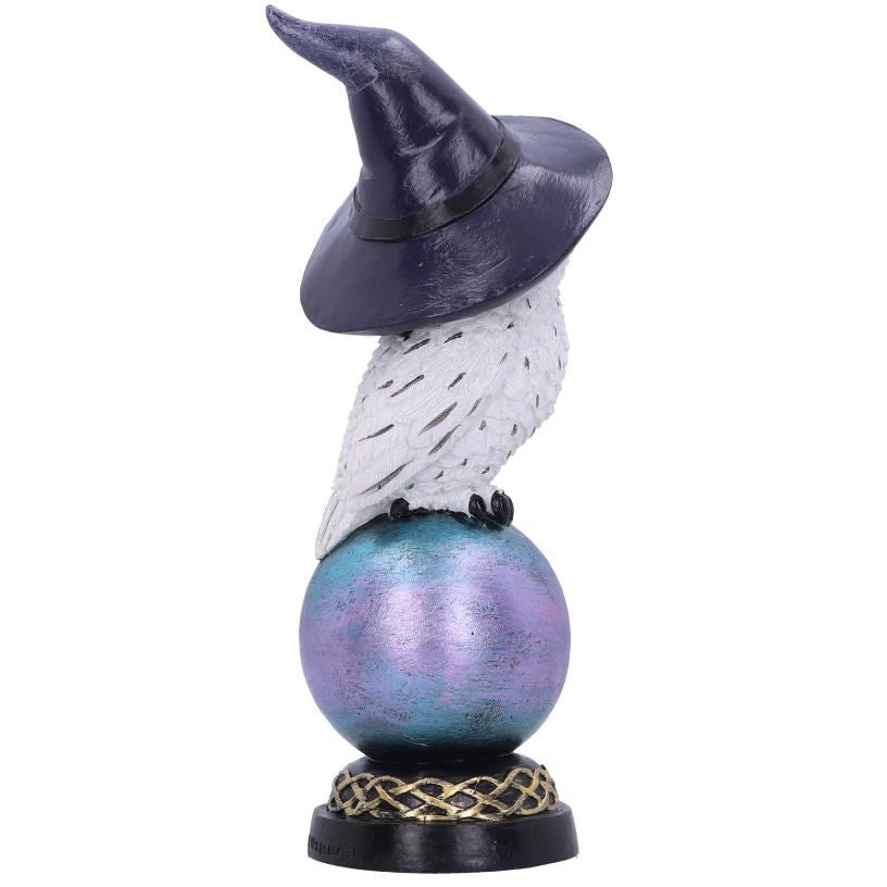 Perched on top of a colourful crystal ball, this owl can be seen holding onto a golden pentagram charm. With its wings tucked by its sides and a witch’s hat on its head, he sits wide-eyed staring inquisitively into the distance. Cast in the finest resin before being carefully hand-painted.