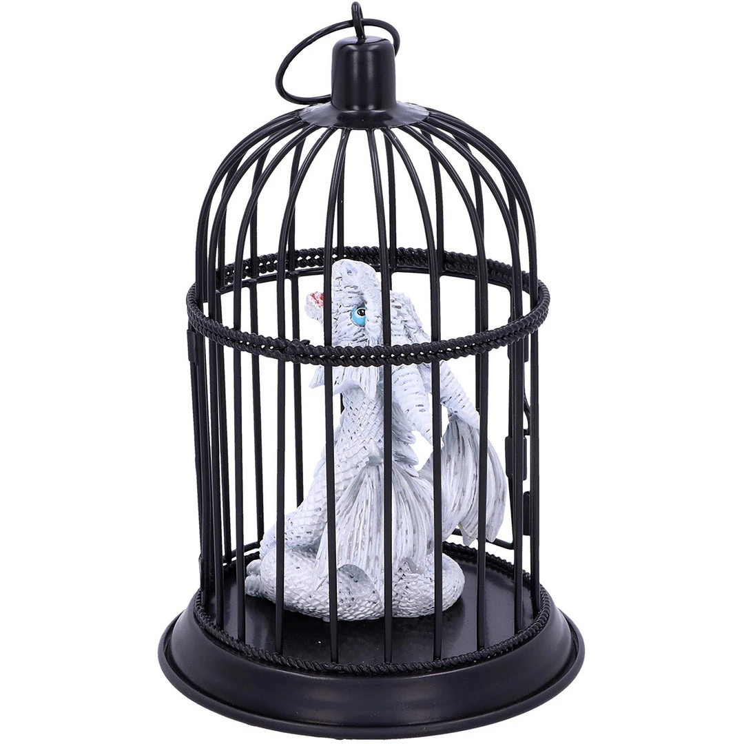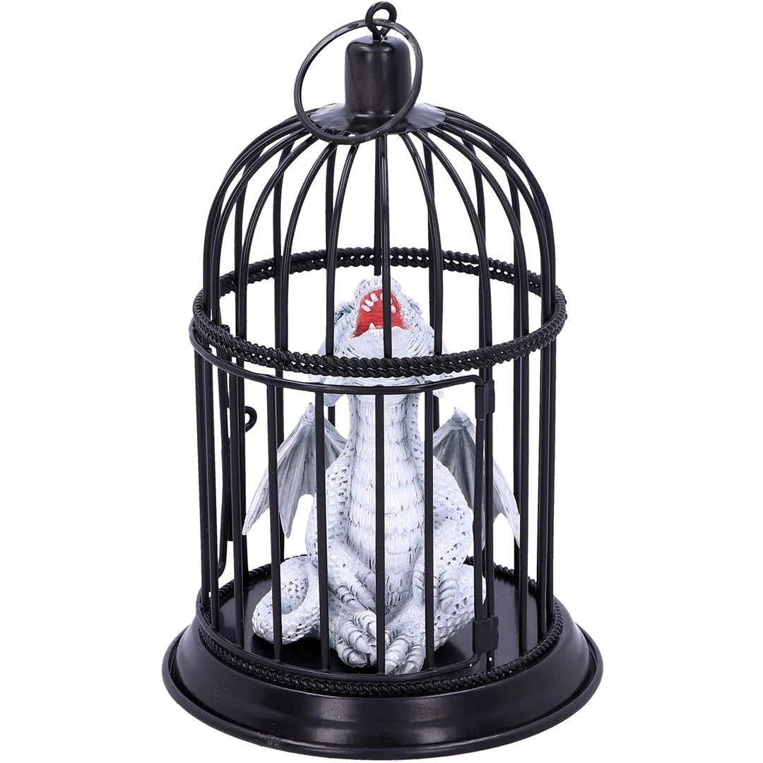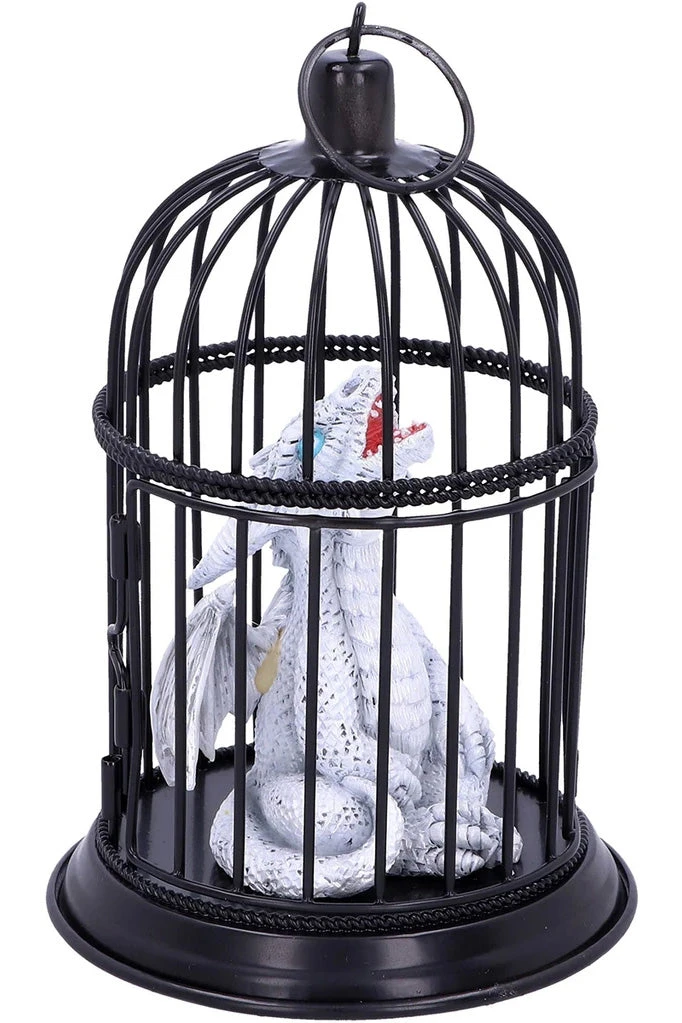 This small caged Dragon is perfect for displaying on a shelf or as a hanging ornament. Inside a small black cage, a White Dragon sits on its hindquarter, eyes staring upwards to its Dragon Master. Wings spread behind, this scaly pet is eager to be freed. At the front of the cage, there is a small door which is fully functional, allowing the owner to take out their companion. When removing the Dragon from the cage you will notice that it is magnetised to the base, allowing the owner to rest easy, knowing that their pet will not be sliding around in the cage! Cast in the finest resin before being expertly hand-painted, this piece is perfect for those who are in love with these mythical giants.