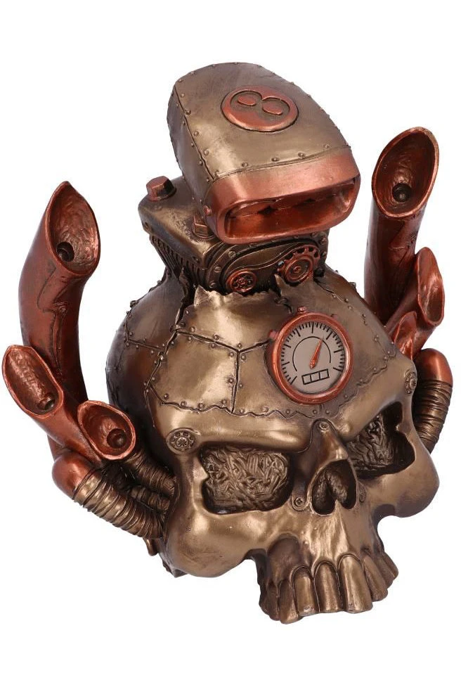 This motor skull is cast in high-quality resin before being carefully hand-painted. A vintage bronzed hot rod engine cracks through the riveted skull while a gauge sits centrally on the forehead. Large pipes emerge from the curved cheekbones of this unusual cranium, perfect for any motor loving petrolhead!
