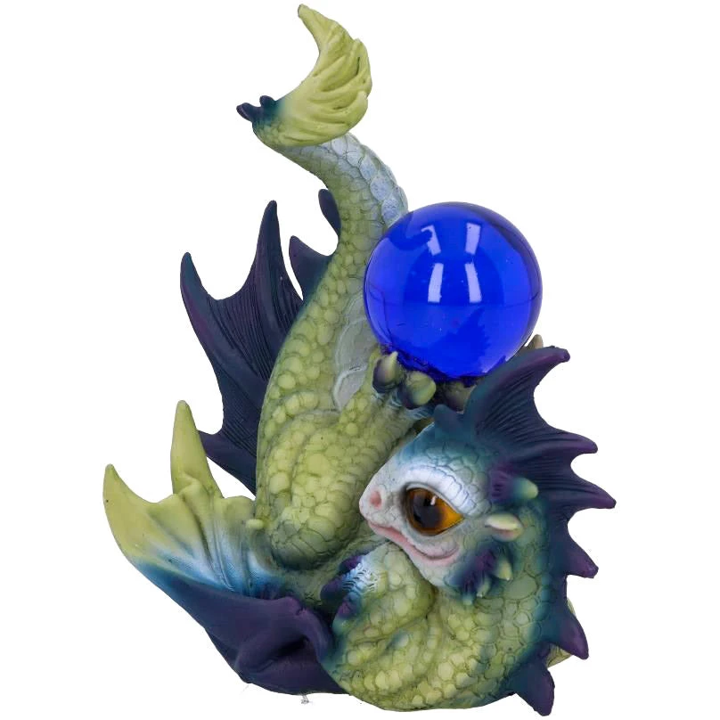 Watch as this wide-eyed creature emerges from its shell into this unfamiliar world. Featuring bright-green scales with dark-blue accents on their claws, horns and wings, this enchantingly adorable hatchling is playing with his royal blue orb, putting on an act for all to see. Cast in the finest resin before being expertly hand-painted, this is the ideal gift for any lover of mythical beasts!