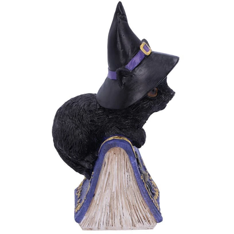 This charming cat figurine is cast in high-quality resin before being painstakingly hand-painted. Hocus is feeling playful while standing tall, next to a purple spellbook. With a black Witches hat on her head and large silvered spider decorating the grimoire, this piece is the perfect gift for the charming witch in your life.
