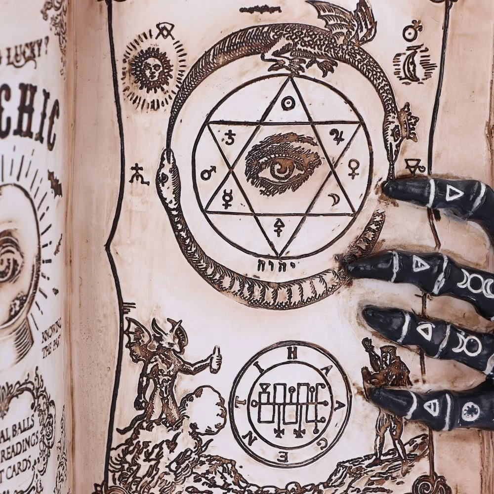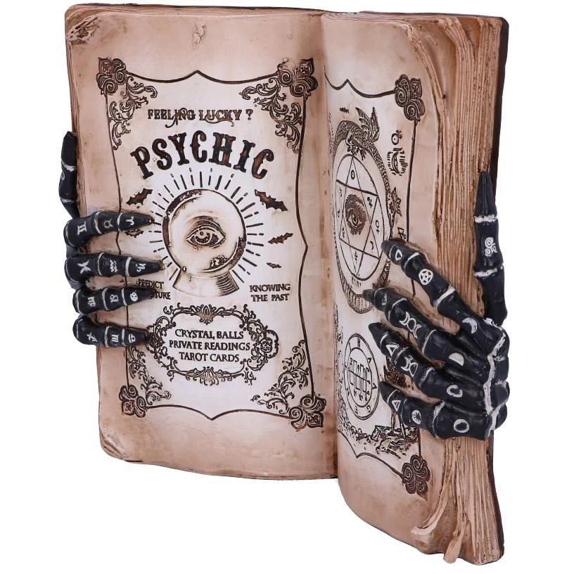 The ancient art of Palmistry developed throughout ancient Eurasia. Palmistry otherwise known as Chiromancy is the claim of characterisation and foretelling the future through the study of the palm. It is believed that by assessing the shapes and lines are on a person’s hand you are able to evaluate a person’s character and their future life. Cast in the finest resin before being carefully hand-painted, these porcelain-like skeletal hands hold open the pages for an aged grimoire, promoting psychic powers. Perfect for any aspiring Psychic!
