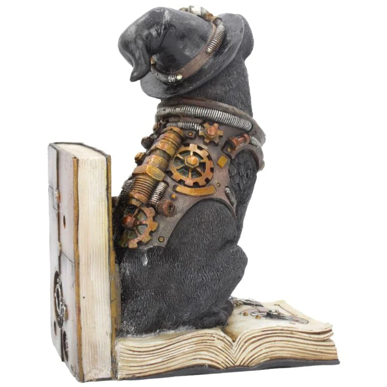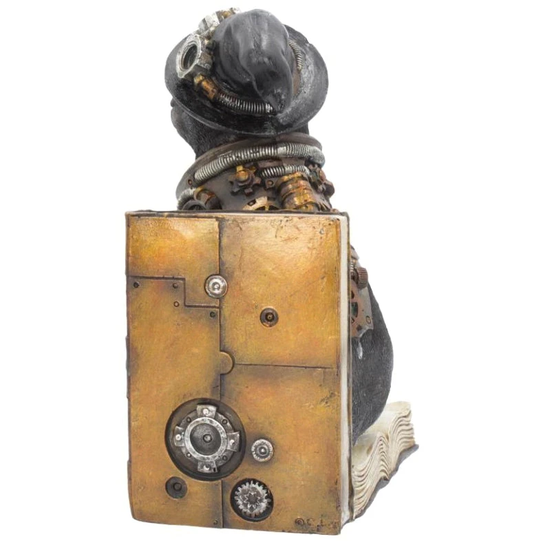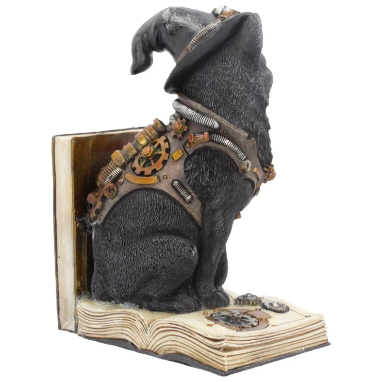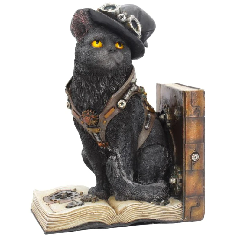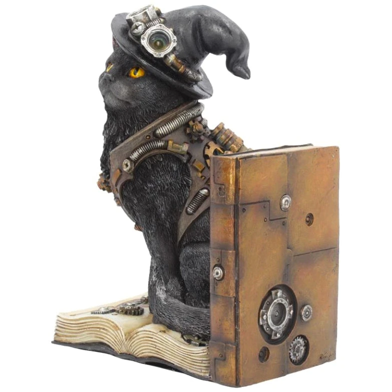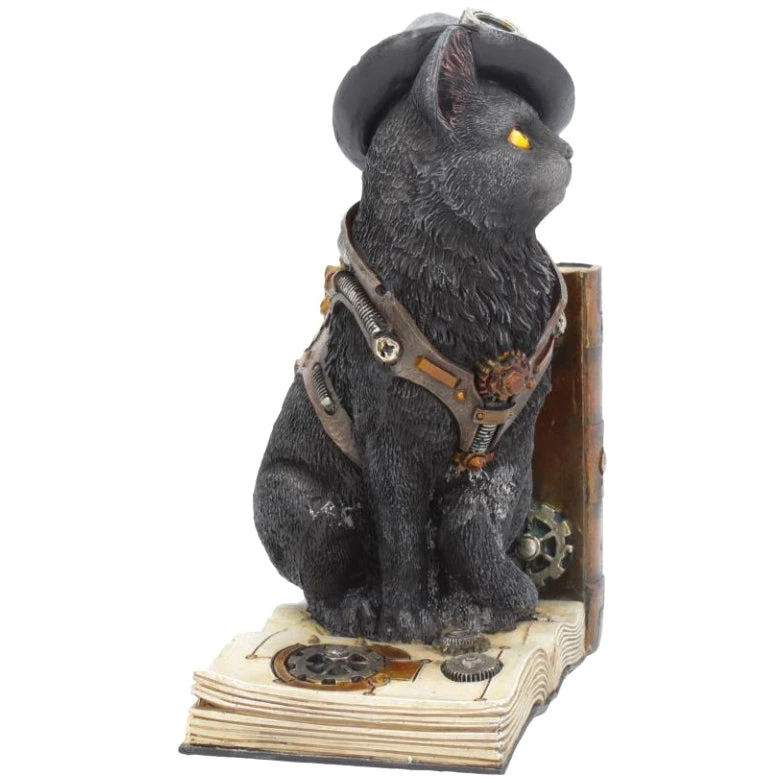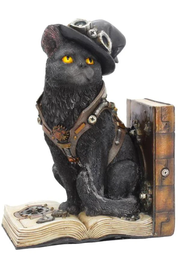This debonair cat comes filled with Steampunk style. Our furry friend stands atop an opened book and leans next to a closed one. A leather harness covers her back while a crooked witches hat and goggles adorns her head. Cogs, gears, springs and rivets decorate the items and carry on throughout out her outfit. Cast in the finest resin before being painstakingly hand-painted, this item will look great on any bookshelf. Why not purchase our Augmented Wisdom to make a perfect pair?