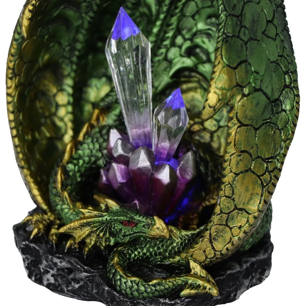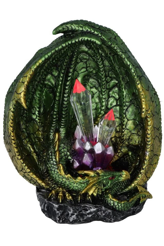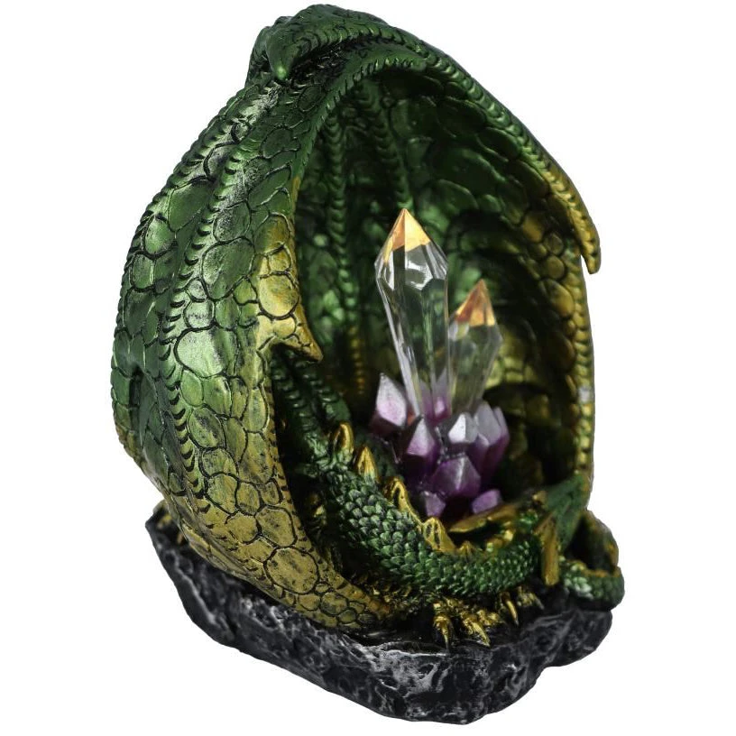This emerald Dragon keeps his crimson eyes open for any intruders trying to steal his prized crystals. Bright green in colour, this dragon has striking golden gold highlights and keeps his head low beneath his large wings, surveying his hoard. Cast in the finest resin before being expertly hand-painted, this piece is the perfect accompaniment to any fantasy collection.