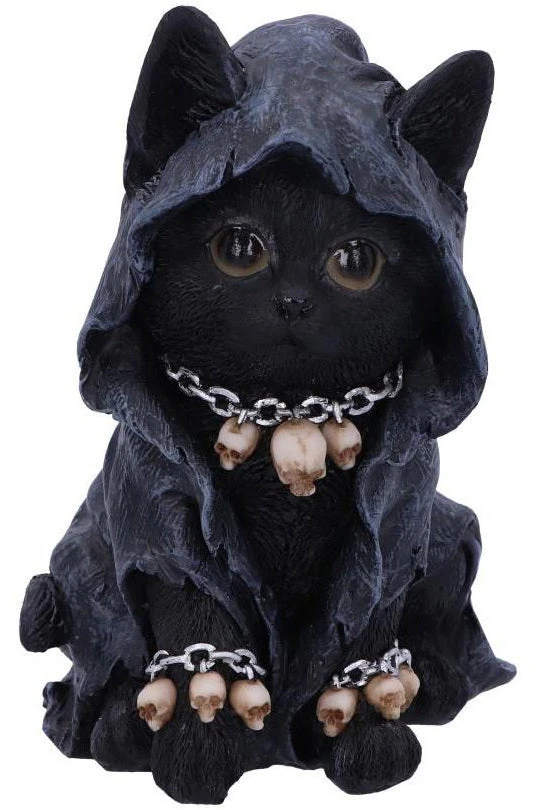 Reapers Feline: This is the feline companion of the Grim Reaper. The black kitten has olive eyes with a chain-link collar and matching bracelets for its feet, attached to the chain-links are small skull charms. The kitty wears a shroud to match that of her master. This little thing truly is Death’s best friend. Cast in high-quality resin before being carefully hand-painted, this kitten is a great gift for any lover of the cute or the macabre.
