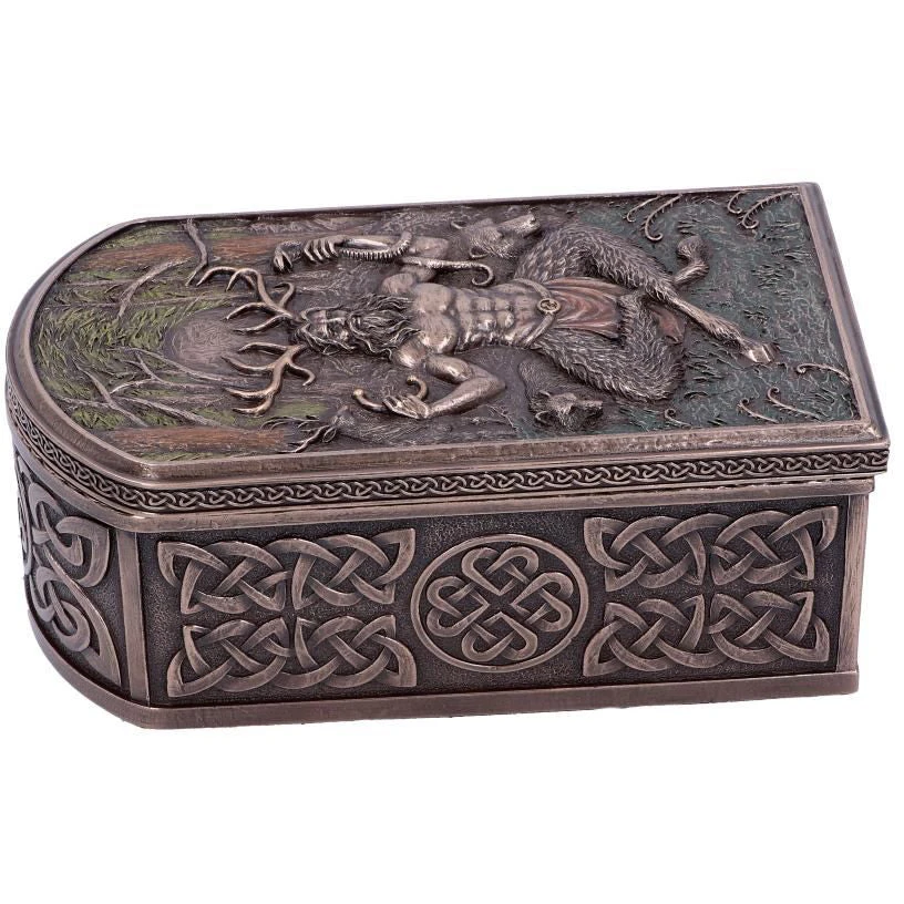 This magnificent box is cast in the finest resin before being given a bronze finish and painstakingly hand-painted. All of the detail is shown on the lid of the box. Sitting on the ground, surrounded by animals, sits Cernunnos, the Horned God of the forest from the myths of the Celts. Over crossed shaggy goat legs, a red loincloth is held in place with a golden belt. A large triskelion sits on the belt buckle, intertwining spirals swirling clockwise. Looking forward with an air of wisdom, his majestic antlers emerge from beneath his long hair. In this left hand, he holds a snake, and in his right, he holds a large bronze torc, symbolizing power and riches. Around him stand a stag, a bear and a small fox. Around the edge of the box, a thick Celtic pattern can be seen. Perfect for the modern pagan, this fantastic Celtic box is the perfect centrepiece for any alter or coffee table.