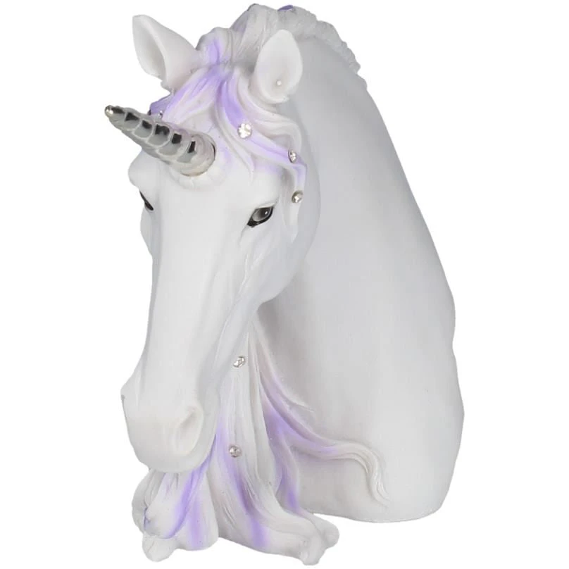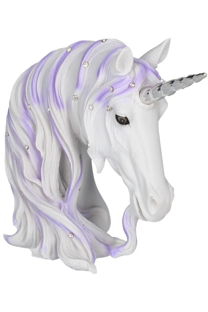 This enchanting unicorn bust is filled with magic. Looking ahead, this small white unicorn stares with deep, black, soulful eyes. Their silver horn spirals forward from their head, and their jewel-studded mane and beard is tinged with violet. Cast in the finest resin before being carefully hand-painted, this fantastic bust makes a great addition to any side table or mantelpiece.