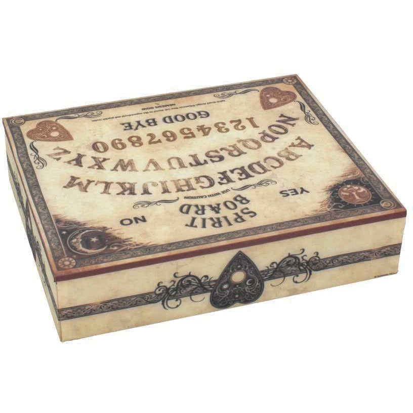 This enchanting jewellery mirror box comes from the imagination of our in-house design team. Spirit boards have long been one of the most powerful occult tools there is. The edges are bordered with intricate baroque designs and ornate planchettes. The background of the box is aged and has the alphabet marked out in an arc on the top. Each side of “Goodbye”, two ornate planchettes are pointing towards the centre, as if ready to move. The design also includes numbers 0 to 9 and the words YES and NO, as well as a warning to use with caution – the power of the spirit world is not something to take lightly.
