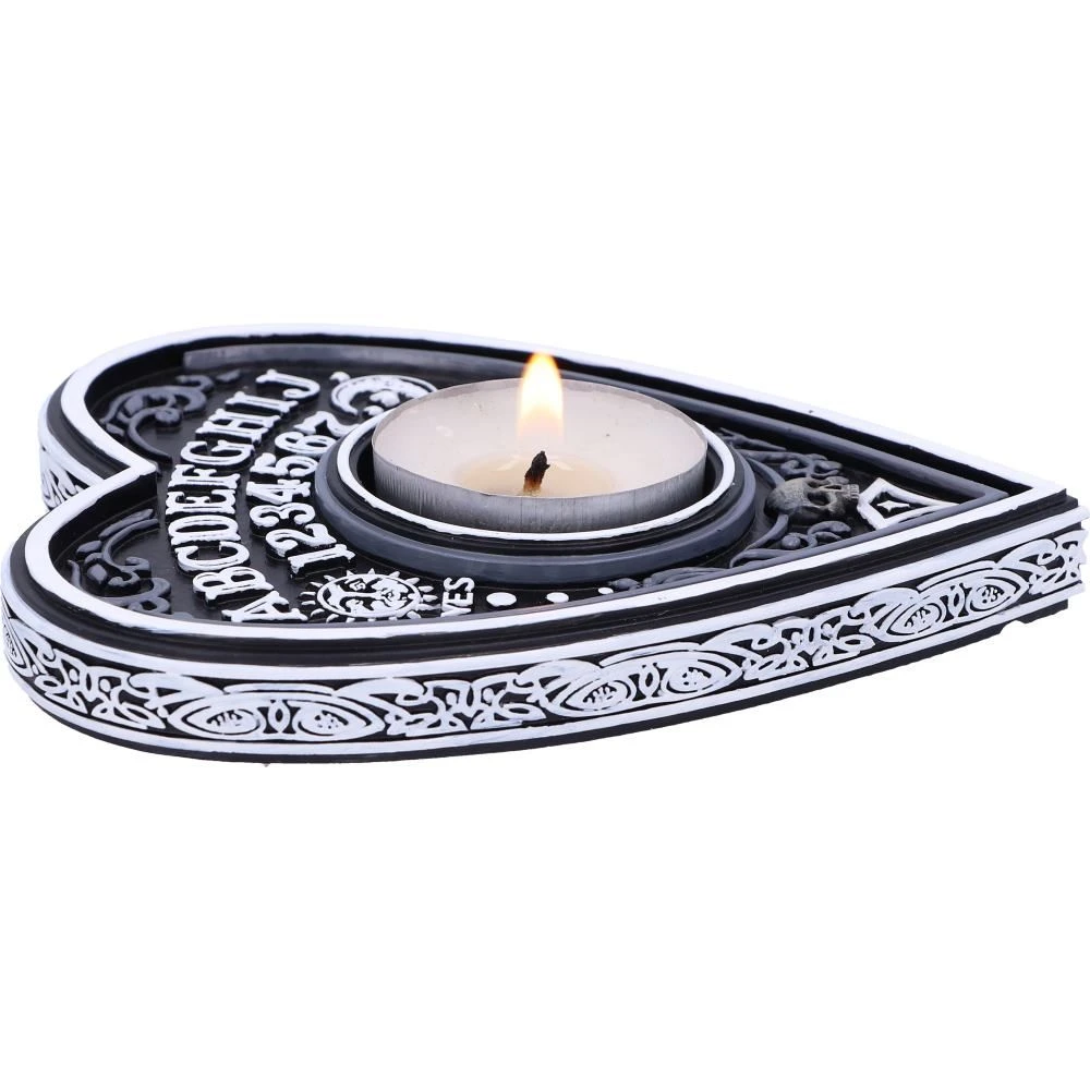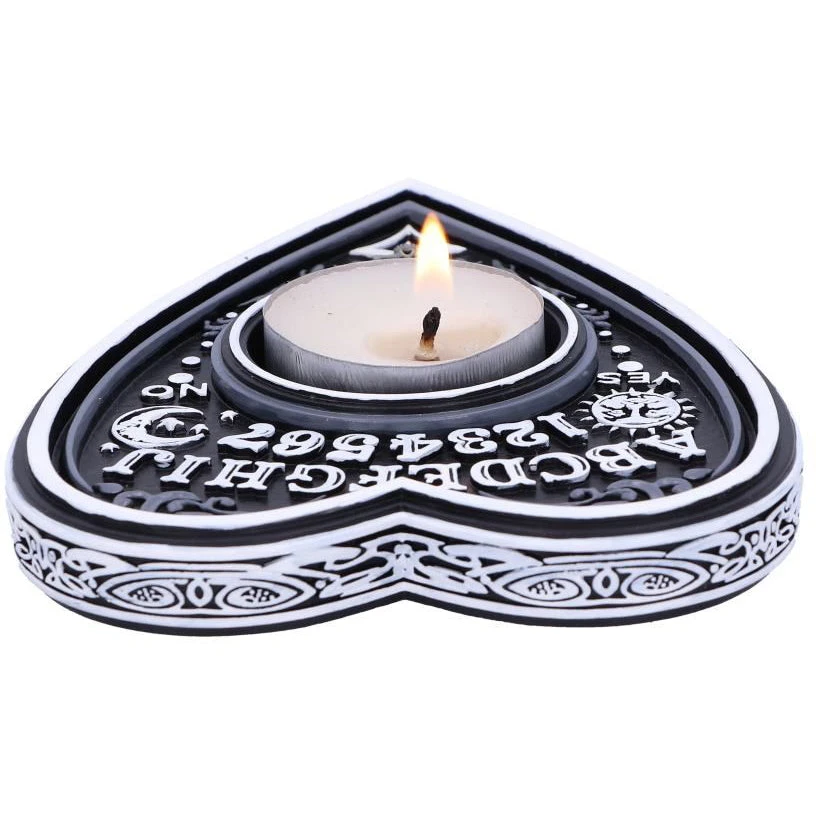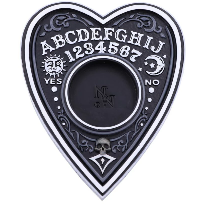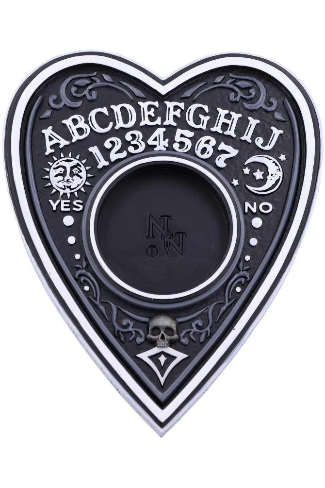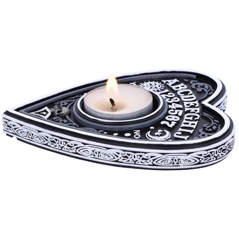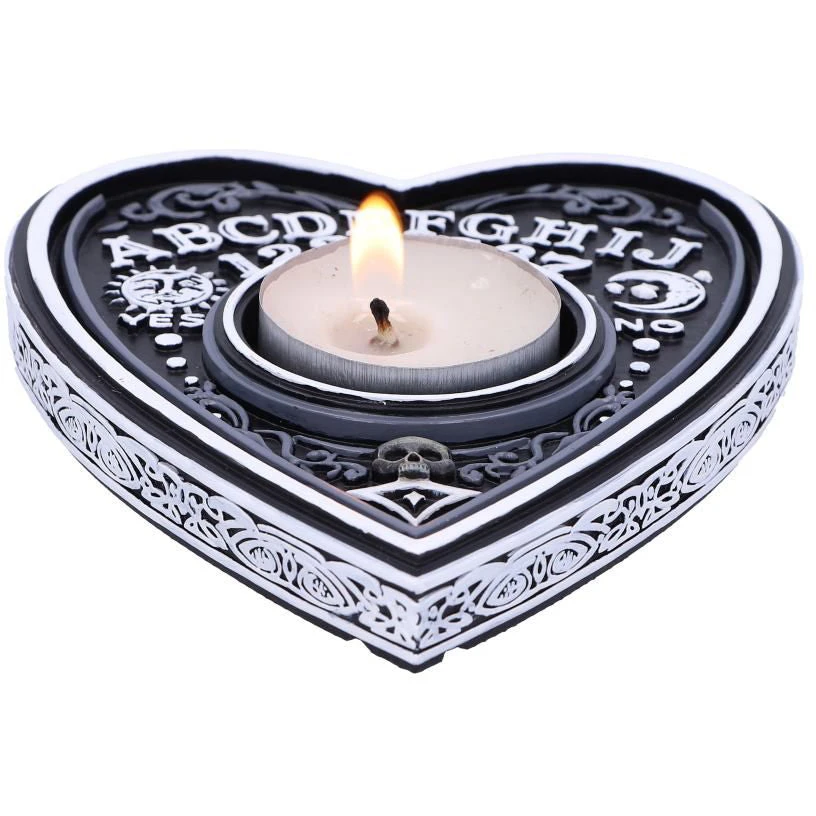 This tea light holder is inspired by the Planchette – a heart shaped piece of wood with multiple wheel casters and a pen aperture held on the underside, which is used to facilitate automatic writing, leading to the creation of mysterious messages created by a medium as they communicate with receptive spirits as apart of a séance. This black heart shaped tea light holder is decorated with our original white ornate design. Holding a single tealight, this piece is perfect for both decorative lighting and ritual use, and is sure to be the centre of your spirit board collection.