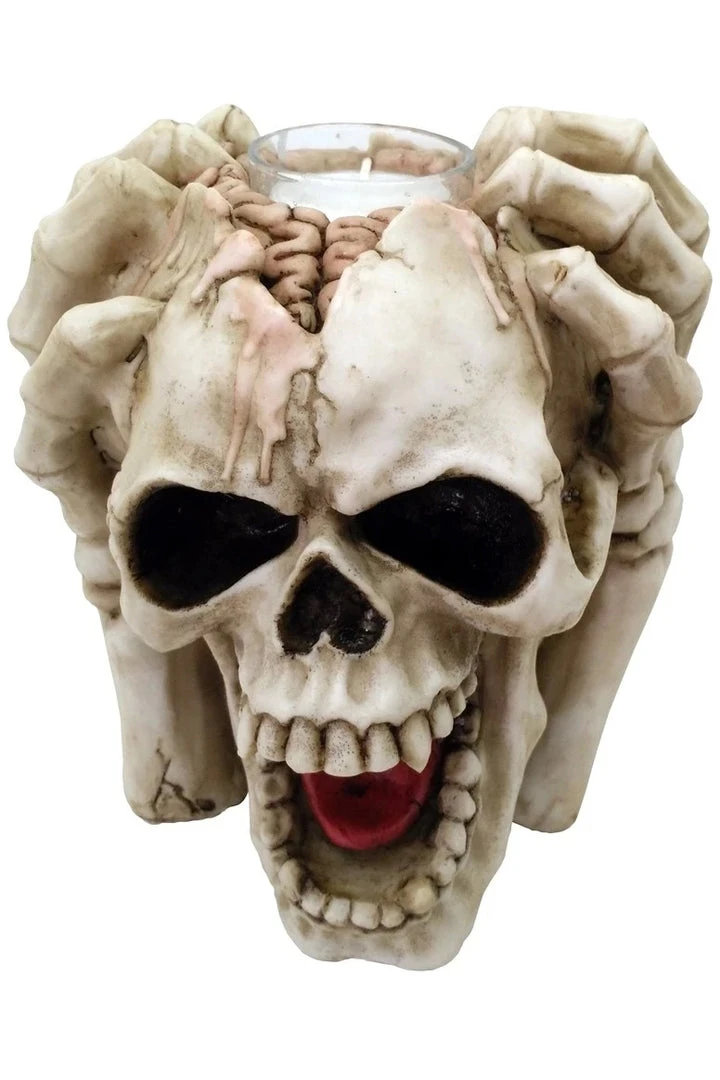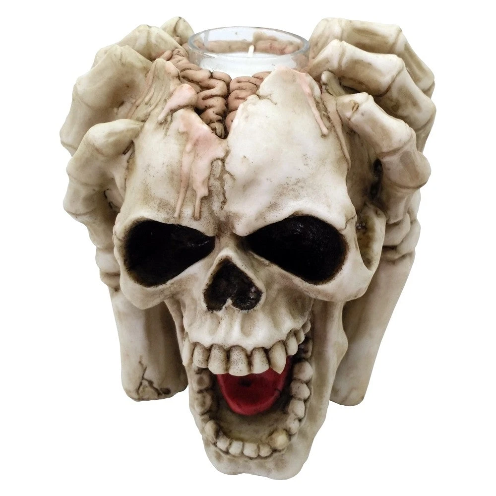 This great gothic Tea Light Holder is made from resin and features a screaming skull clasping it’s head with both hands, with the skull split open in the middle to reveal the brain and also to house the glass tealight cup in the top!