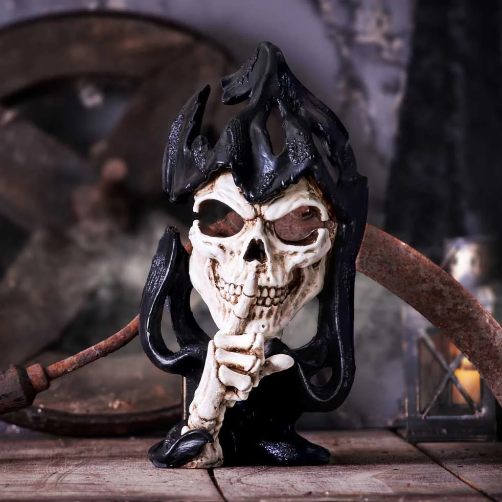 The physical personification of death, this Sssshhh Reaper figurine will hauntingly silence you and guide your soul into the afterlife. His skeletal hand brings one finger to an evil grinning mouth whilst engulfed in a shredded long black hooded-cloak. Cast in the finest resin before being expertly hand-painted, this hush Reaper will make the perfect addition to any Gothic collection.