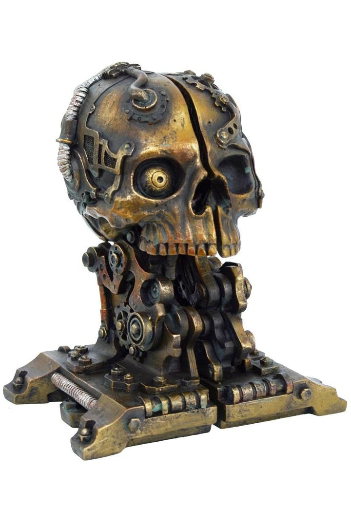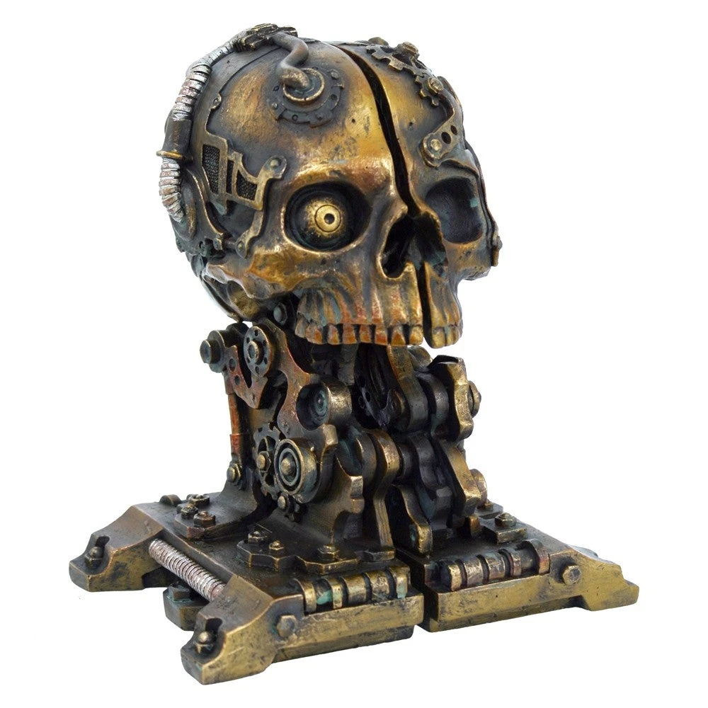 This awesome pair of steampunk book ends in resin come together to form a complete skull figurine adorned with gears and mechanical mechanisms or used apart as bookends can hold up each end of your book collection!