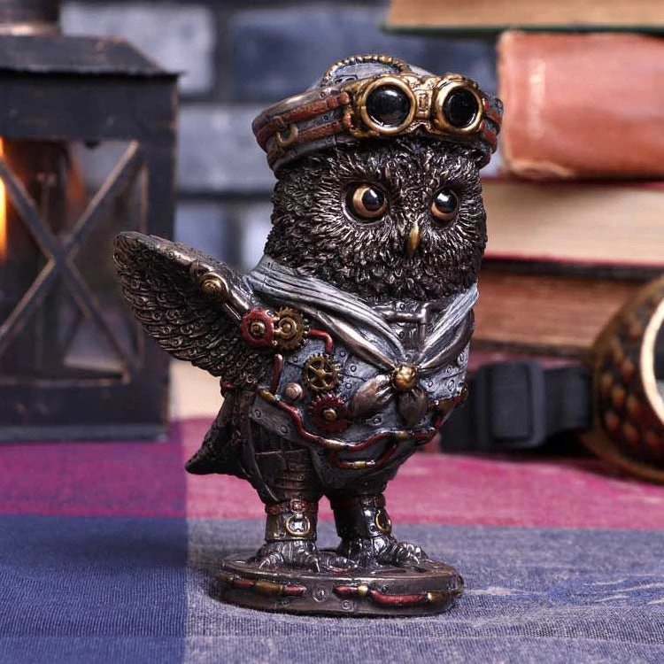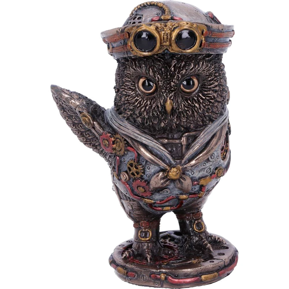 This adventurous little owl is prepared to take flight with leather aviation goggles, and mechanically enhanced wings he’s planned for every eventuality. The owl’s light eyes stare off to the side with razor focus, this little chap can certainly provide you with a birds-eye view. This steampunk-inspired figurine is cast in the finest resin before being painstakingly hand-painted, this item will look great on any bookshelf or mantel.