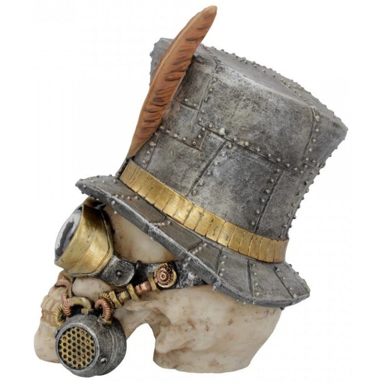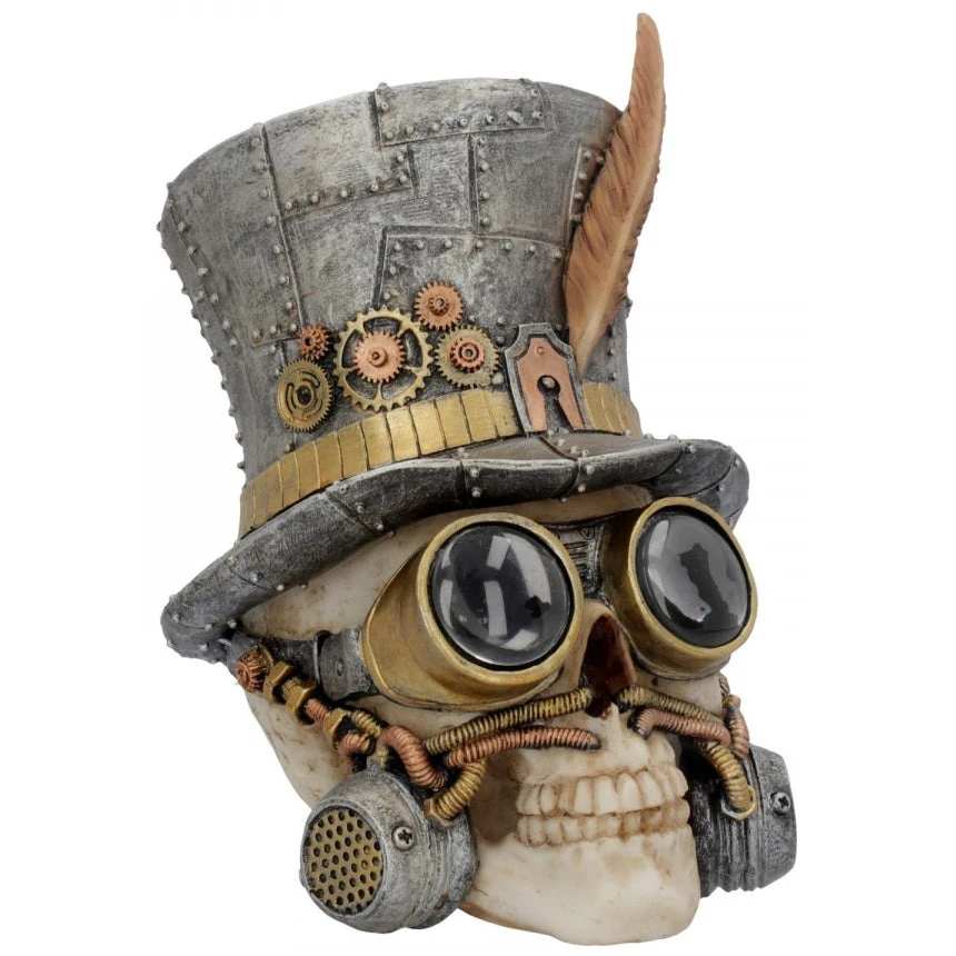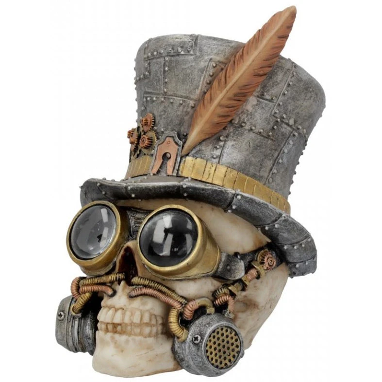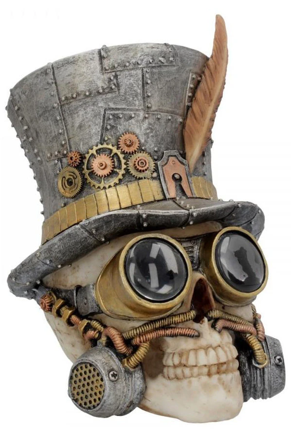 This quirky skull is perfect for any Steampunk fan. He wears a large mechanical top hat, detailed with an elegant feather. His large goggles are the focal point of this piece, with thick glass lenses and sturdy brass-look rims. Cast in the finest resin before being painstakingly hand-painted, this skull would make the greatest addition to any alternative store.