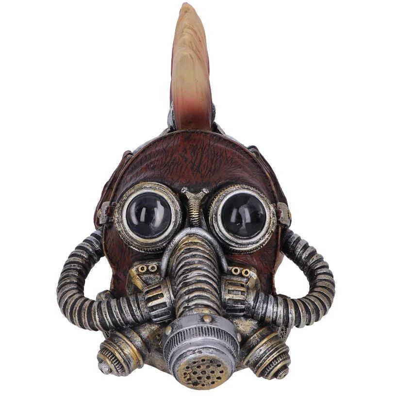 This natural looking skull is perfect for any steampunk fanatic. Staring ahead, the Flame Hawk skull is clad with a leather mask embellished with metallic breathing apparatus. The mask appears to be held together by leather straps that cover the back of the skull, adorned with flaming feathers. Cast in high-quality resin before being carefully hand-painted, this skull adds a fantastical flaming flare to any home.