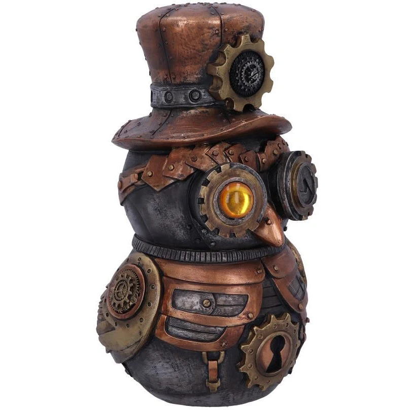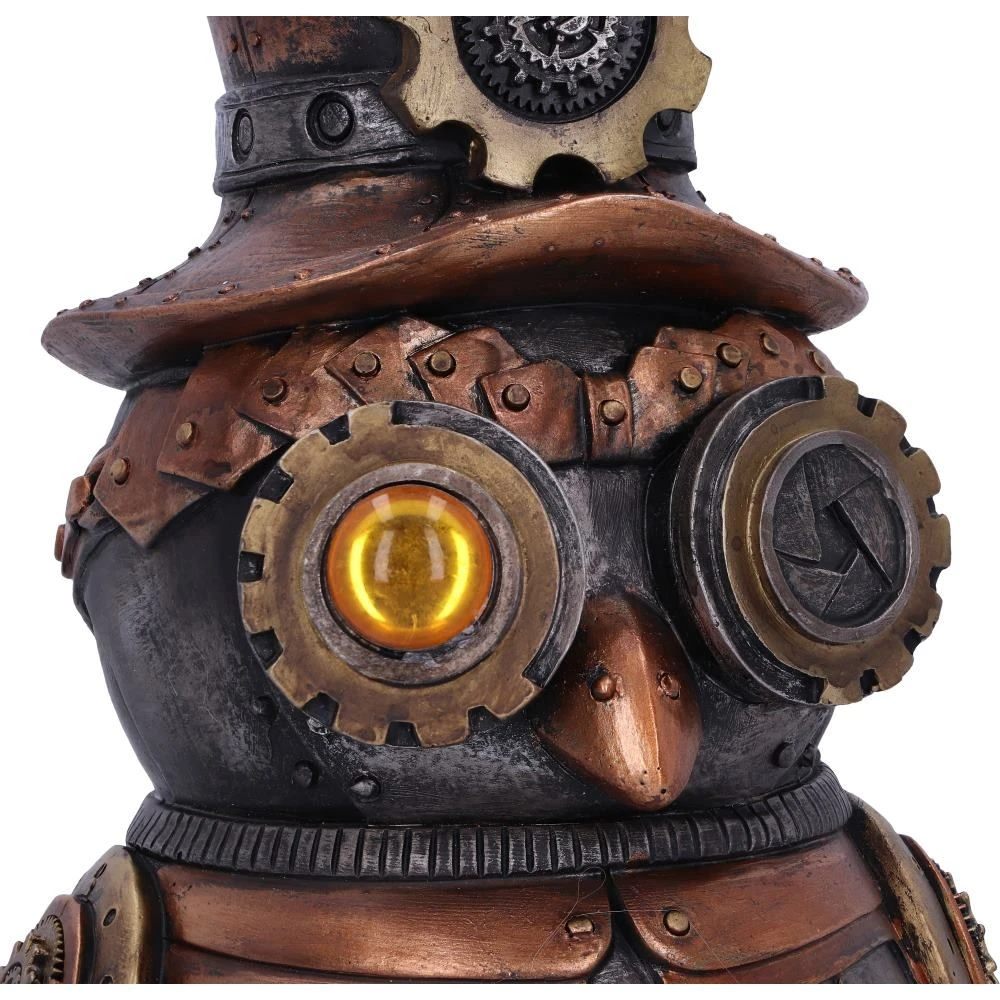 This mechanical owl has its Metallic wings folded at their side, individual feathers riveted in place. Large eyes protrude from its face, one a large cog with a shutter at the centre, and the other a large amber gem. It wears a bronzed top hat, adorned with a large gear and has a keyhole on his torso. Cast in the finest resin before being painstakingly hand-painted, this Steampunk figurine is the perfect companion to have when you take flight.