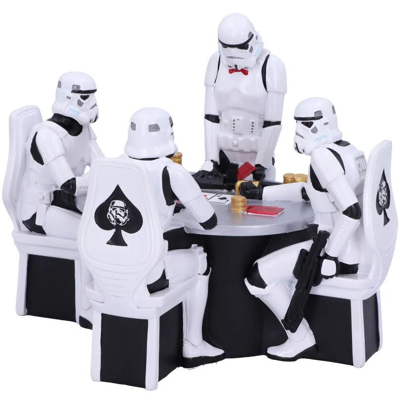 Bringing out their quirky charms, brilliantly executed Stormtrooper scene. Cast in high-quality polyresin before being expertly hand-painted, this figurine shows three Stormtroopers sat around a poker table while one stands in as croupier (note the red bow tie). Based on the original moulds that Andrew Ainsworth of Shepperton Design Studios produced, the Stormtroopers to the left and opposite the Croupier are invested in his every move, while the Stormtrooper to his right is looking away, holding his E11 Blaster at his side. He waits patiently, will the cards fall in his favour?