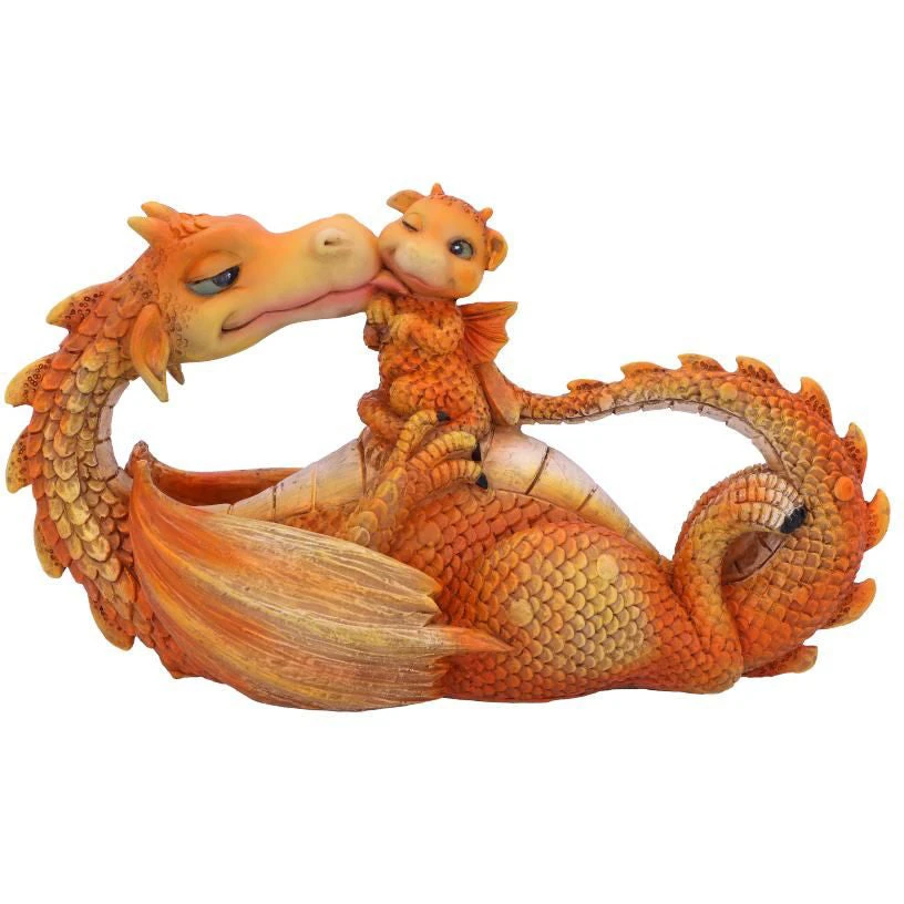 Sweetest Moment (Orange): This adorable figurine shows a bright orange mother dragon laying on her back, with her hind legs raised and her wing tucked in for balance. The mother holds the newborn wyrmling in place with her claws and tail. Playfully, the mother kisses her bashful child as it sits on her belly. Cast in the finest resin before being hand painted this figurine is likely to charm the most austere dragon enthusiast.