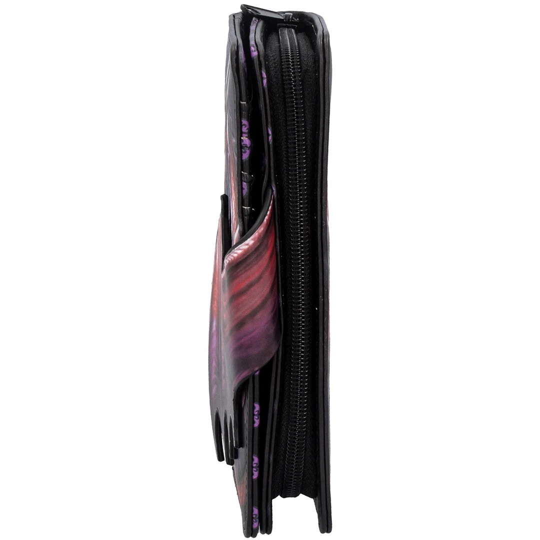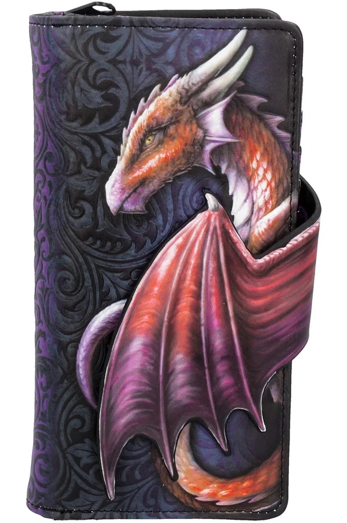 Dragons have been a part of folklore and literature since the dawn of time, whether they be treasure hoarders or flying menaces and now you can own your own piece of mythology with our Take Flight Purse. Featuring the profile of a beautiful Red Dragon, with its large wing covering its side, this purse is not what it seems. The wing can be unfastened to open the card holder slot! Genius! Covered in embossed Baroque designs, this purse has multiple slots for holding both cards, cash and coins.