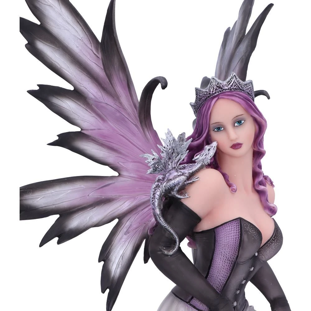 This stunning fairy figurine, with detachable wings will make the perfect centrepiece in any room. Sitting peacefully with drapes of her skirt surrounding her, icy tones of purple cover her hair and wings whilst a small young dragon stares lovingly into her eyes.