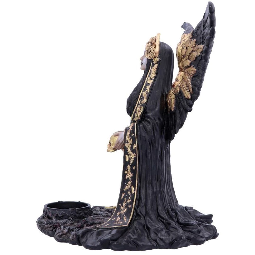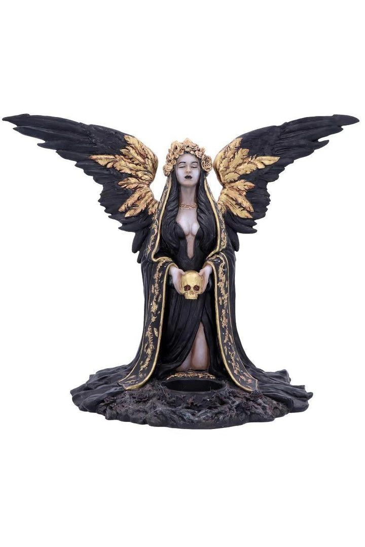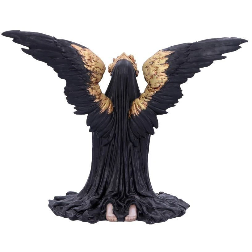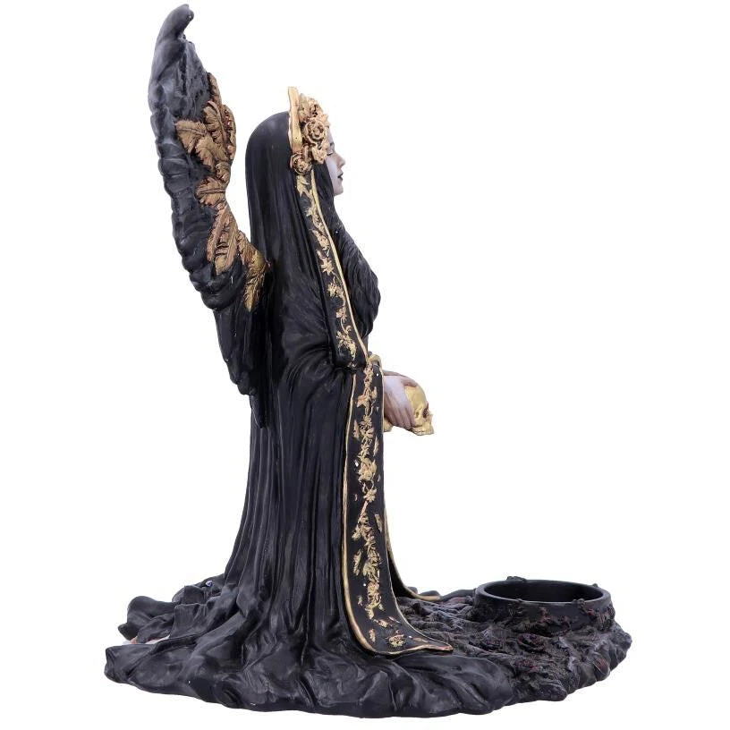 This beautifully detailed, black and gold angel is darker than we imagined. Named Teresina which means ‘The Reaper’, this temptress kneels on the ground, a burning candle dancing in front of her. Her long black robe drapes from her head and pools on the dark ground. Intricate golden patterns cover the fabric and are mirrored in the floral crown that is placed on her head. A pair of large black wings emerge from her back, edged in the same gold that can be found on her robes. In her hands, she cradles a golden skull, a powerful talisman which helps her guide souls onto the afterlife. This piece would make the perfect centrepiece. Cast in the finest resin before being expertly hand-painted, this piece was designed and sculpted in the UK by our own designers and sculptors.