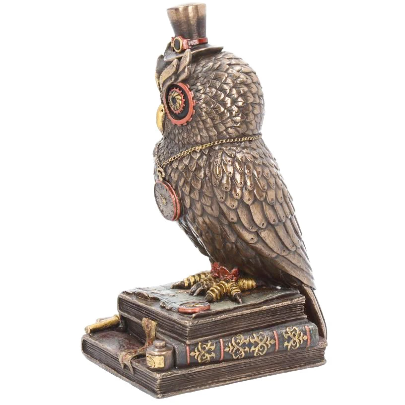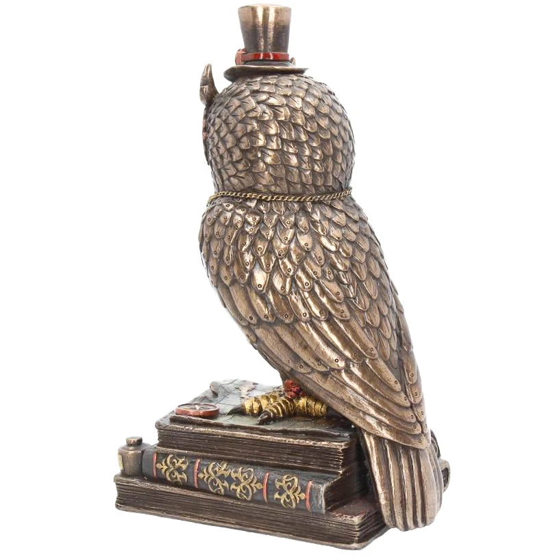 Standing on a stack of leather-bound books, this mechanical owl is almost the real thing. Metallic wings folded at their side, individual feathers riveted on, a red clock hangs from a gold chain around their neck. Eyes shaped like large red cogs have a golden shutter at the centre, and are topped with large brass eyebrows. Sitting on top is a small top hat with goggles sitting on top, while around the books, a map and some navigator’s tools are scattered. Cast in the finest resin before being painstakingly hand-painted, this Steampunk figurine is the perfect companion to have aboard your airship.