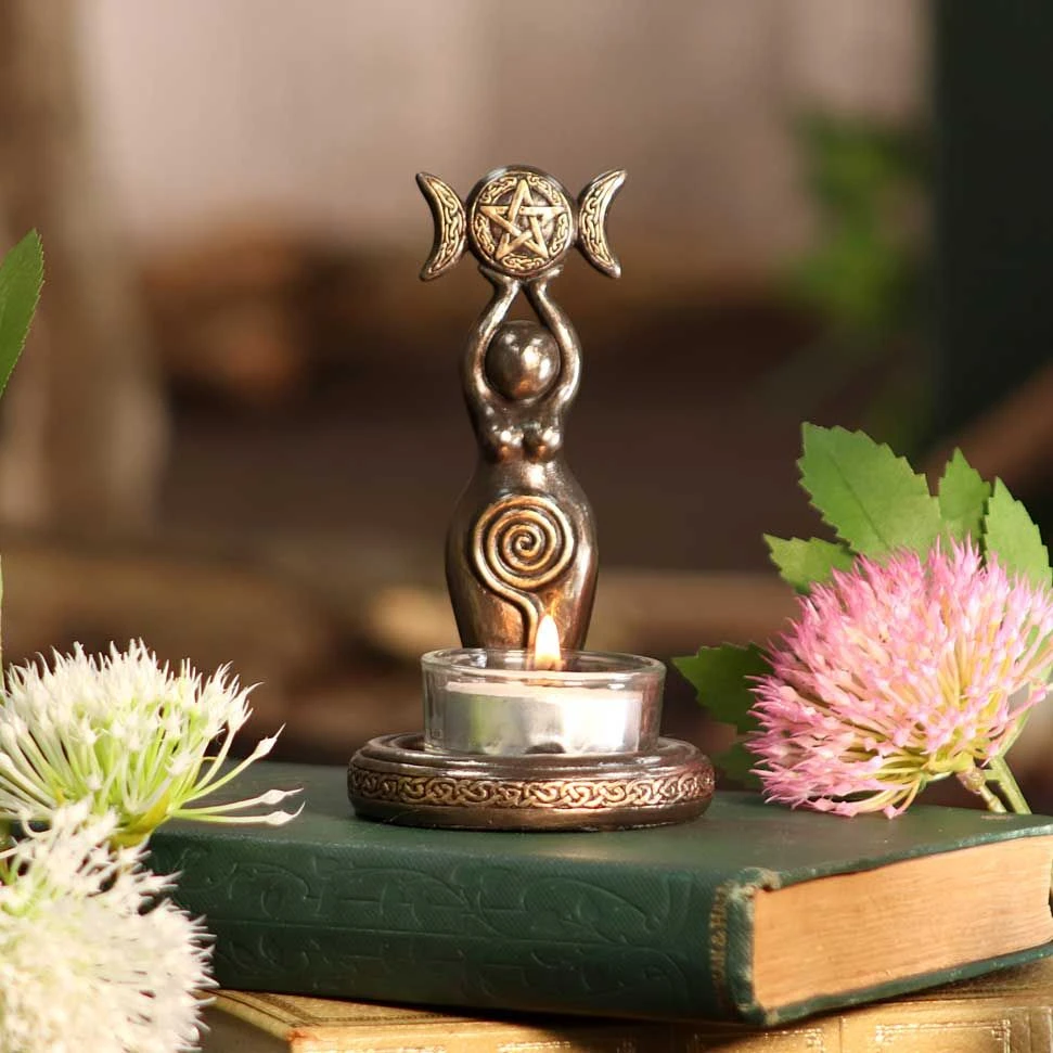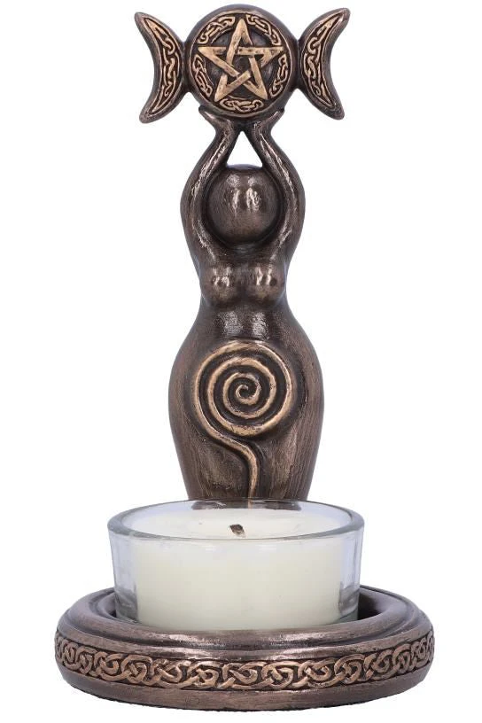 Honour the sacred cycles of the moon with the Triple Goddess Tealight. Rising from a round base, this faceless figure symbolises the eternal feminine, the outline of a tree rising up to their wide hips. Above their head, they hold a triple moon triumphantly. Cast in the finest resin before being given a bronze finish, this stunning Triple Goddess Tealight can keep your customers grounded to the cycles of the earth and cosmos.