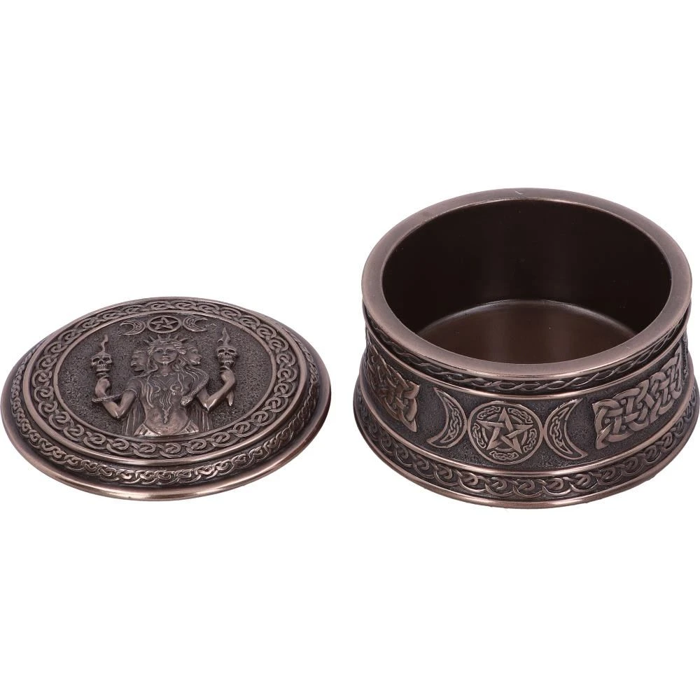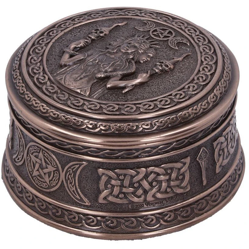 The lid of this box features the Triple Goddess, Maiden, the Mother and the Crone, each of which symbolises a separate stage in the female life cycle and a phase of the moon. The base of the box again features the Triple Moon symbol as well as lots of networks of small knots adding detail to this piece. Cast in the finest resin before being expertly finished in bronze, this box is perfect for any spiritual lover.