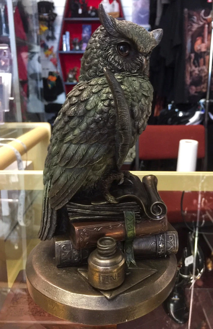 This learned Owl would make the perfect gift for any graduate. Stood atop a pile of leather bound books, this clever owl uses his talon to grasp a Quill and writes his memoirs on a scroll. A small jar of ink sits by the books, ready for the Owl to dip his Quill. The Owl itself is beautifully crafted. The feathers are life like and his large eyes dewy eyes seem to draw you in. Cast in high-quality resin before being carefully hand-painted, this piece is the perfect accessory for any academic’s office.