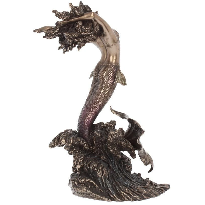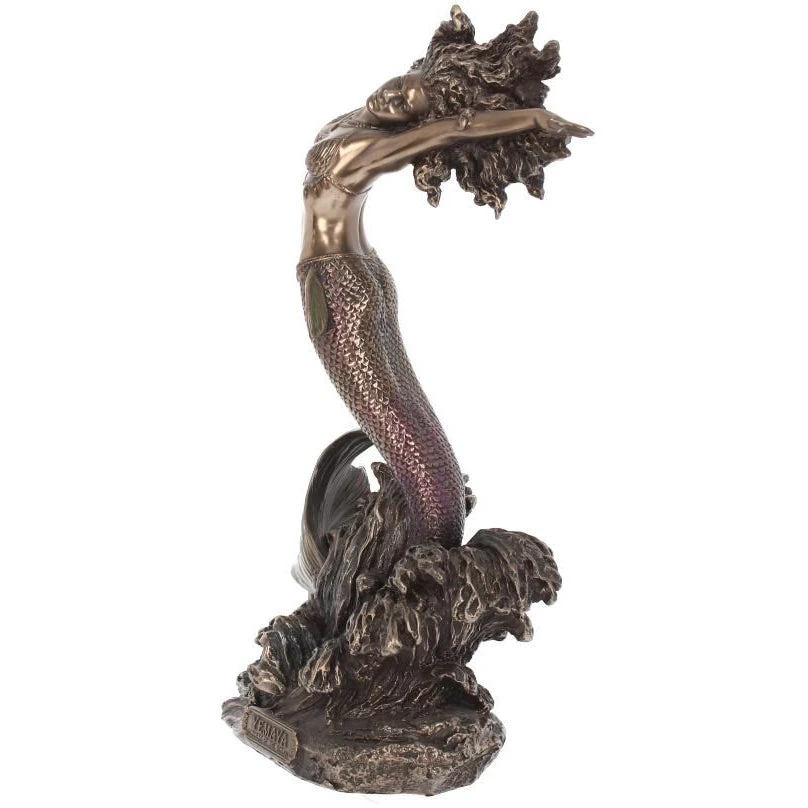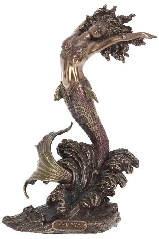 This mystical figure depicts Yemaya, the Goddess of The Ocean. Leaping out from beneath the waves, Yemaya is half woman and half marine creature. As all life is thought to have begun in the sea, all life is said to have begun with Yemaya. She is motherly and strongly protective, and cares deeply for all her children, comforting them and cleansing them of sorrow. Cast in the finest resin before being given a bronze finish, this figure would make a wonderful addition to any home.