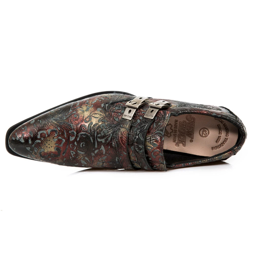 New Rock M.2246 Red Newman Floral Embossed Shoes M.2246-S28. Leather. Handmade shoes. Decorated with 2 silver fasteners, red embossed flower effect and a steel Newman heel. Part of the Newman Collection.