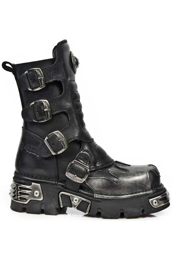New Rock Silver Flame Wild Reator Boots M.591X-S2. Black Leather with Silver Flames. Decorated with 4 Silver Buckles and the New Rock Logo at the front. Reactor Sole. Part of the Metallica Range. Unisex.