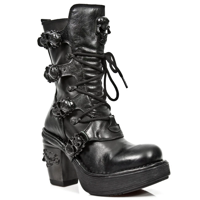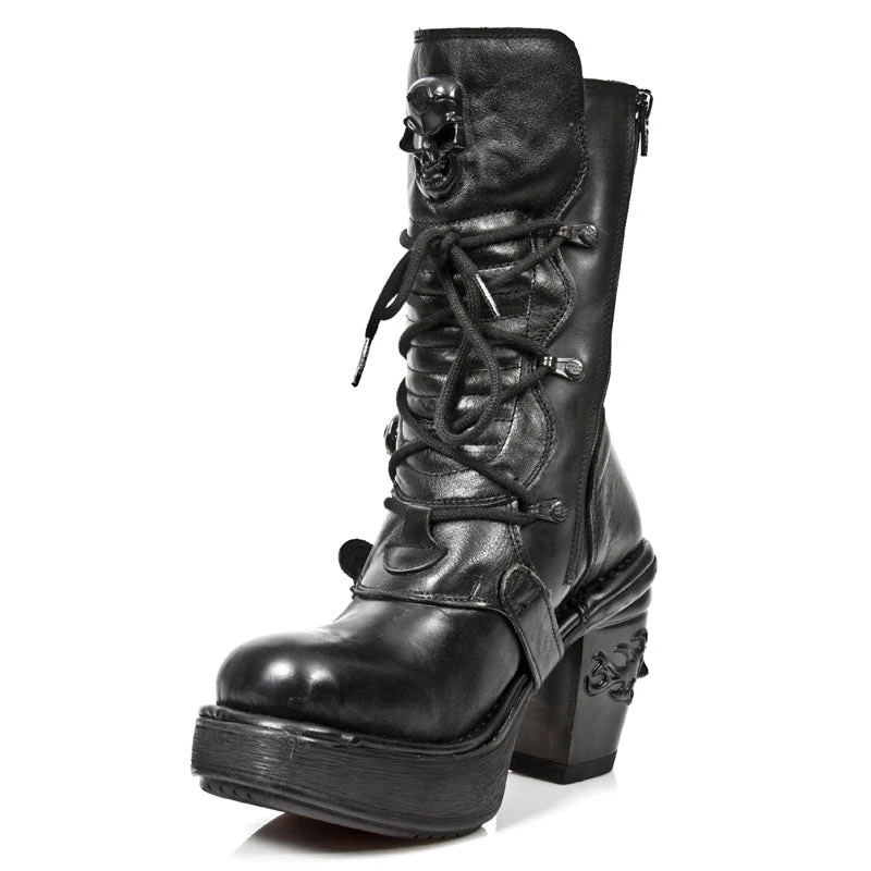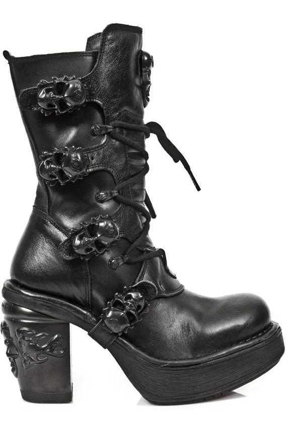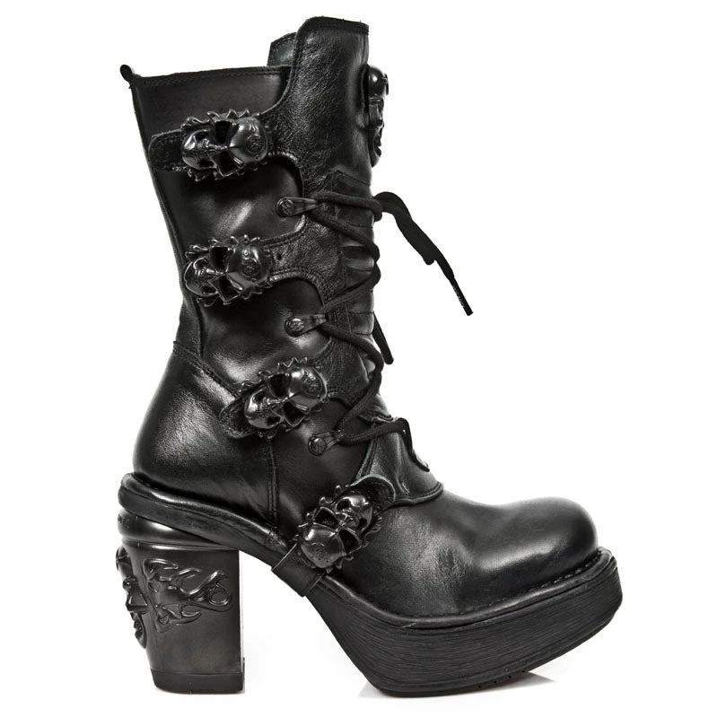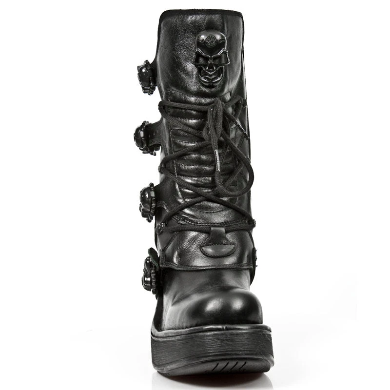 New Rock M.8366 All Black NRK Skull Boots M.8366-S8. Leather. Decorated with 4 black skull buckles. Black laces. Skull badge. NRK heel. Side Zip. Part of the NRK Collection.
