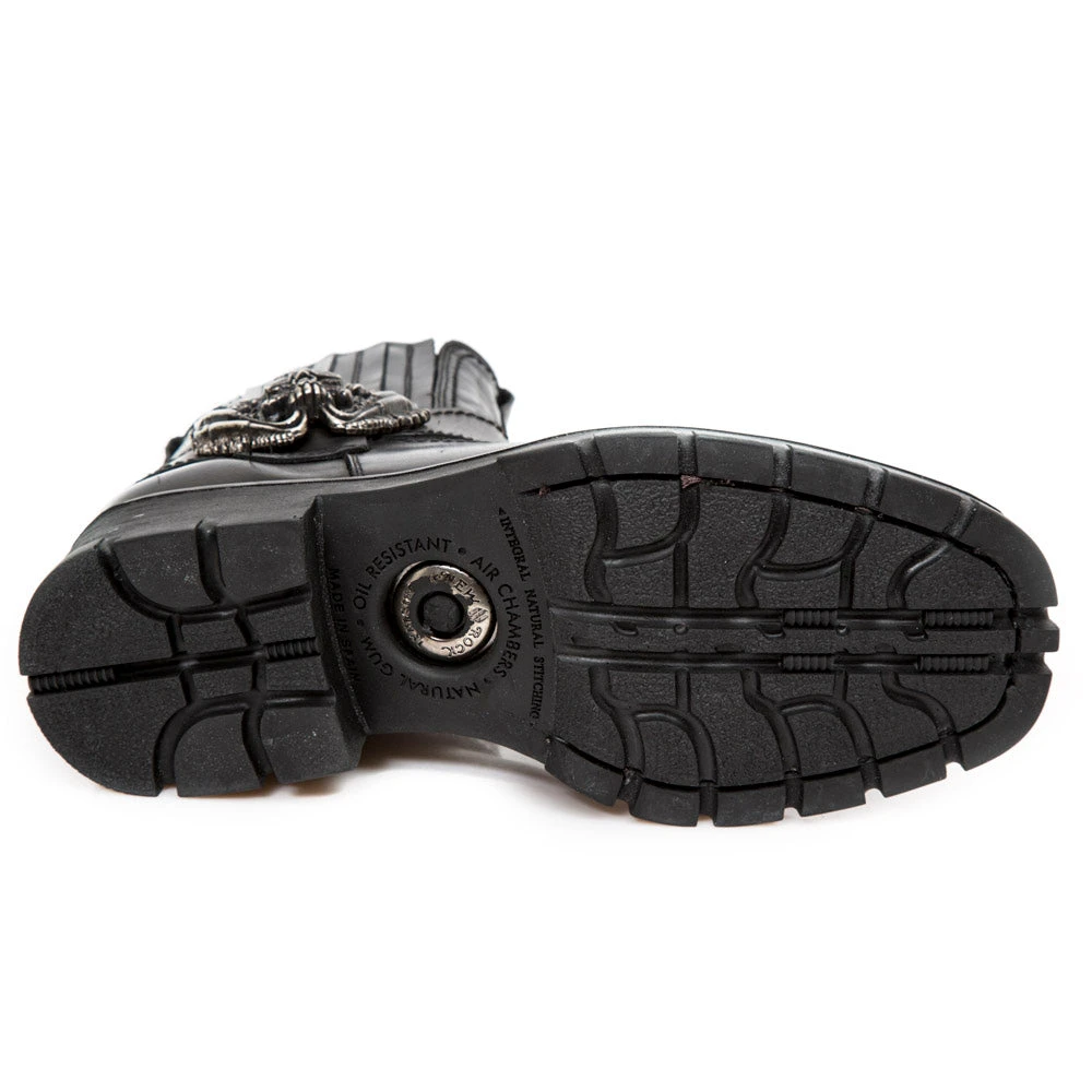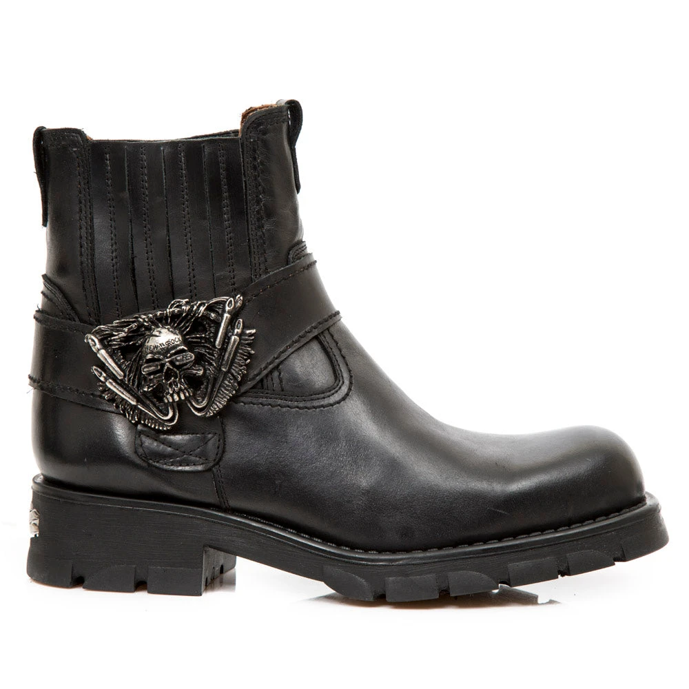 New Rock M.7633 Ankle Boots M.7633-S1. Leather. Decorated with a boot strap with a black new rock skull motif. Elastic Side Panels. Black rubber sole with New Rock on a metal plate. Part of the Motorcycle Collection.