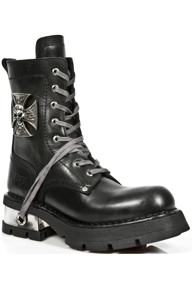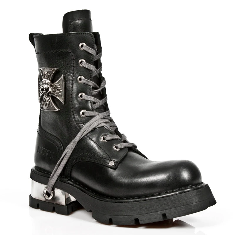 New Rock M1623-S1 black leather biker boots with front lacing, metal eyelets, skull cross badge, metal heel with embossed New Rock lettering and metal New Rock badge in sole.
