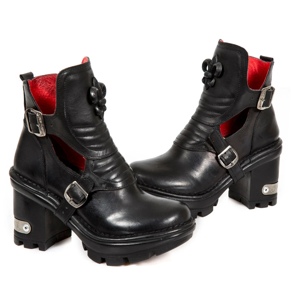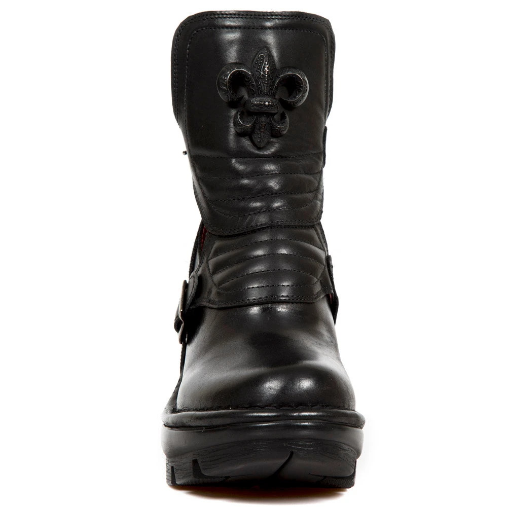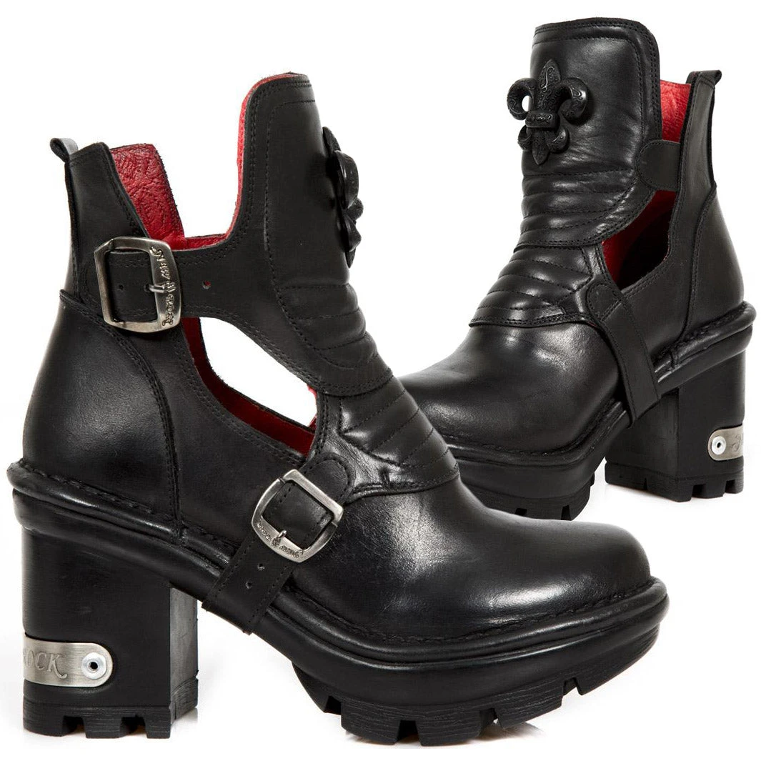 New Rock M.NEOTYRE Fleur De Lys Neotyre Shoes M.NEOTYRE66-S1. Leather. Decorated with 2 silver buckles and a black leur De Lys metal badge. Neotyre heel and platform sole. Part of the NeoTyre Collection.