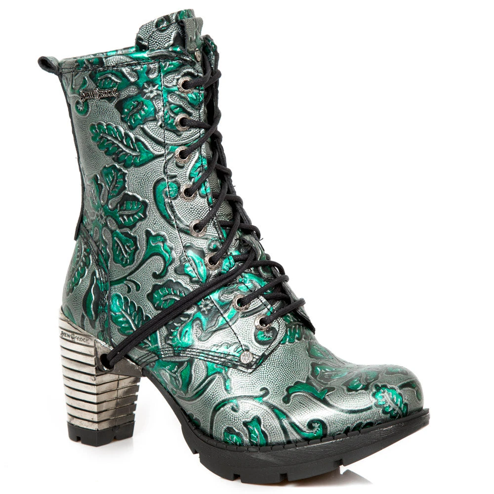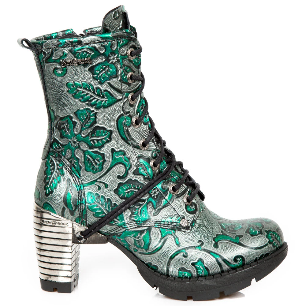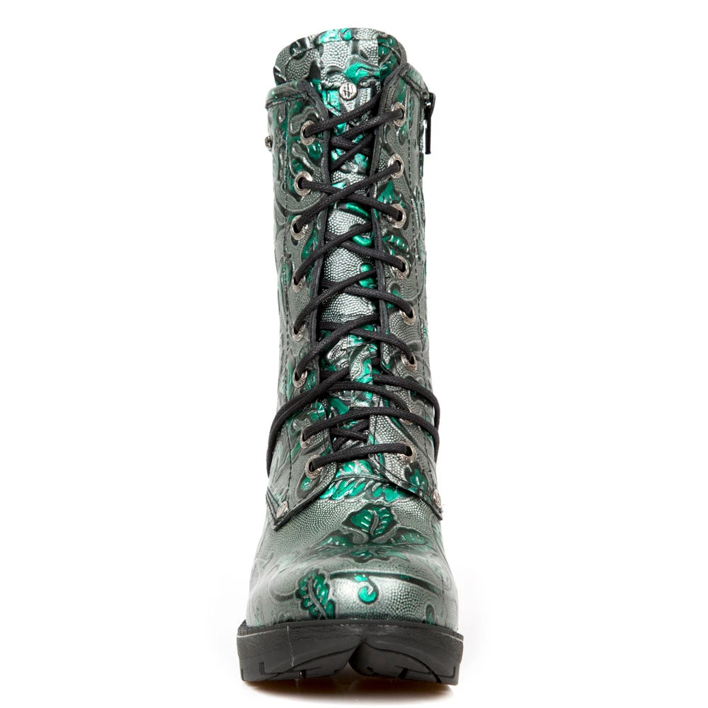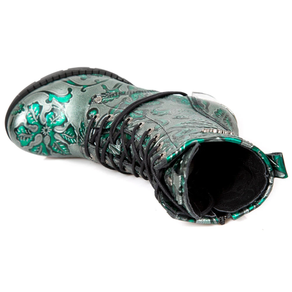 New Rock Green Metallic Vintage Flower Ankle Boots M.TR001-S7. Leather. Embossed flower pattern, with lacing and steel heel. Side zip. Part of the Trail Collection.