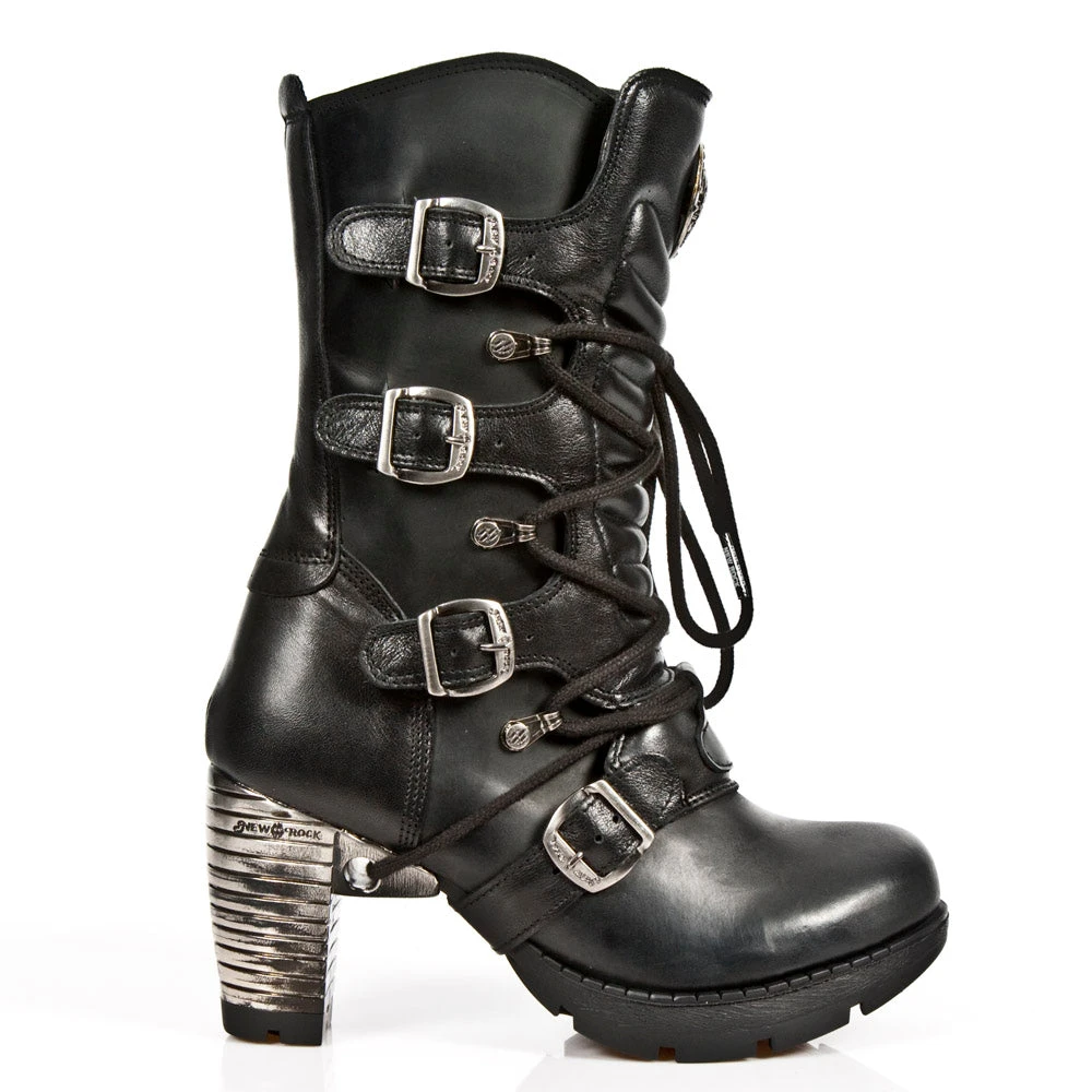 New Rock Ladies Boots M.TR003-S1. Leather. Decorated with 4 buckles and a metal heel. Side Zip. Part of the Trail Collection.