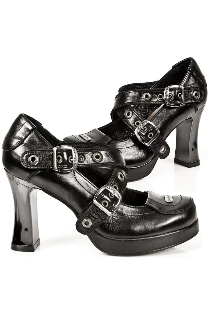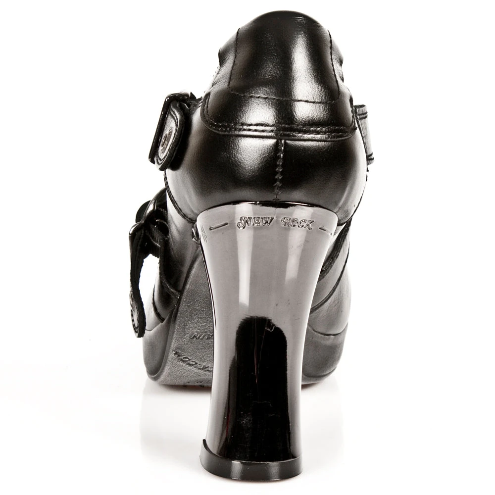 New Rock M.5808 Ladies Shoes M.5805-S10. Leather. Decorated with two straps with buckles. Metal heel and rubber sole. Part of the Goth Collection.