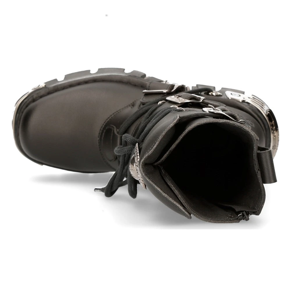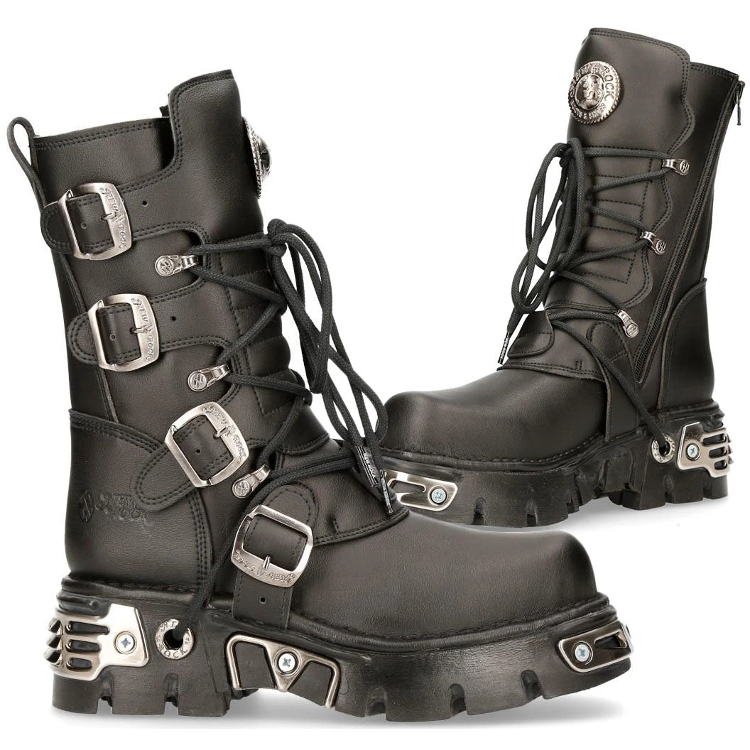 New Rock M.373 Black Reactor Sole Vegan Boots M.373-S7. Four black buckles, black laces, silver New Rock logo, black reactor heel. Side Zip. Unisex. Part of the Metallic collection.