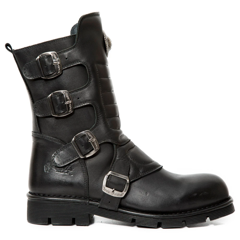 New Rock M.373 Black Wild Comfort Boots M.373X-S10. Leather. Decorated with 4 silver buckles and the new rock logo. Comfort light weight soles. Part of the Wild Collection. Unisex.