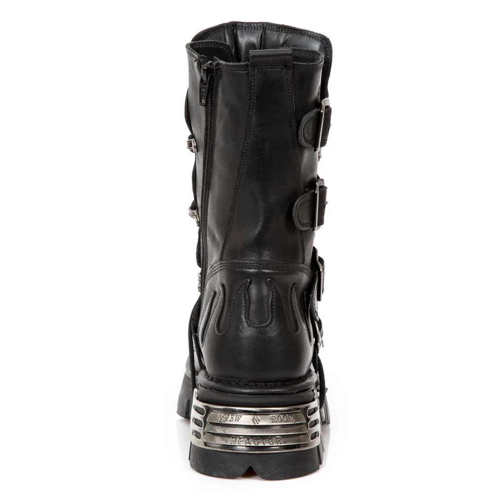 New Rock M.107-C7 Black Mid Calf New Rock Boots. These New Rock Boots have a metal New Rock logo and zip fastening.