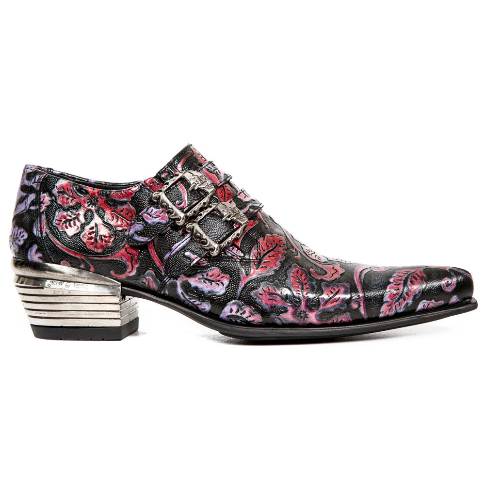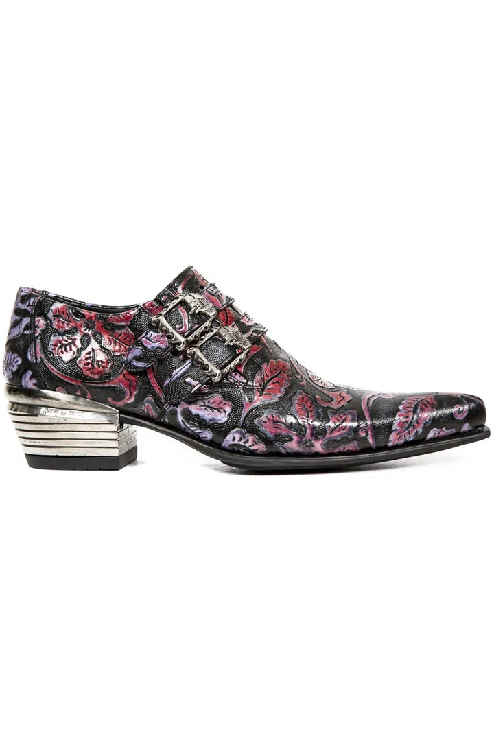 New Rock M.7960 Purple Embossed Vintage Flower Shoes M.7960-S6. Leather. Decorated with embossed flowers in a red to purple colour range and metal heel for contrast. Part of the Dallas Collection.