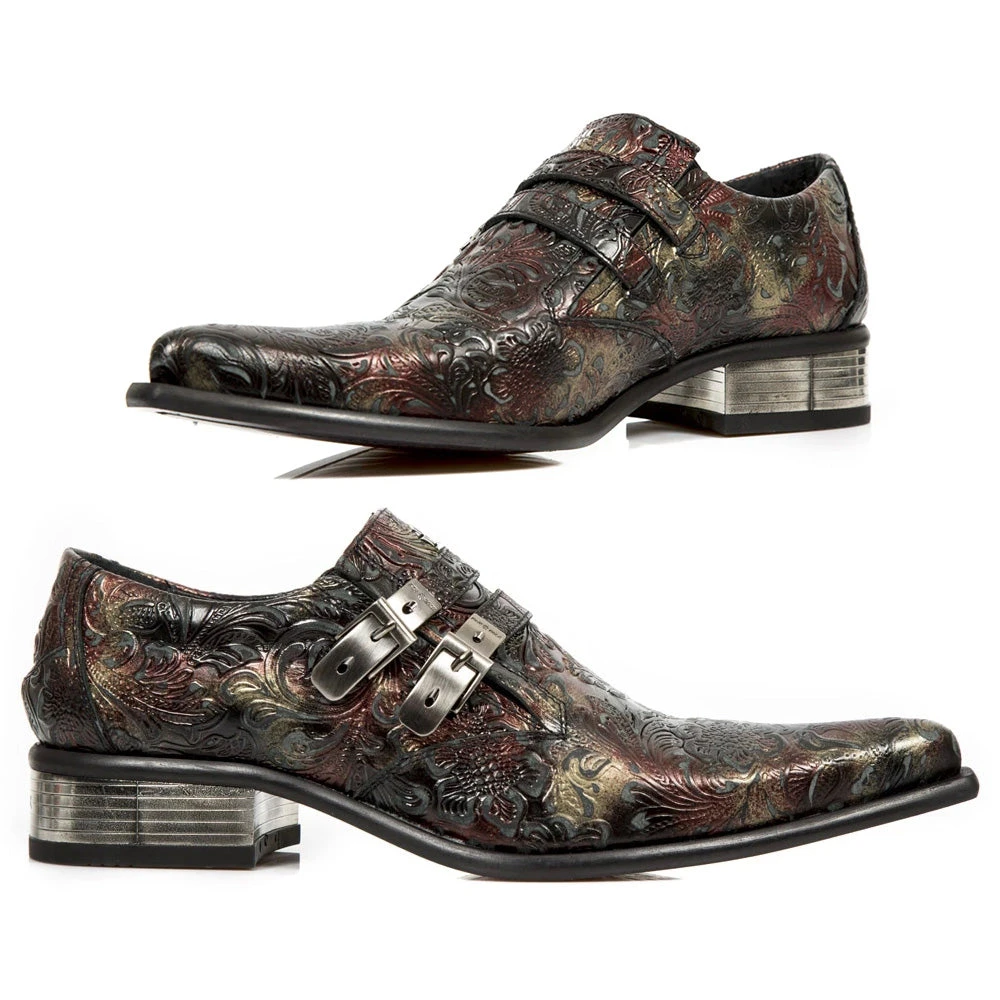 New Rock M.2246 Red Embossed Vintage Flower Shoes M.2246-S27. Leather. Decorated with embossed flowers in a red to gold colour range and metal heel for contrast. Part of the Newman Collection.